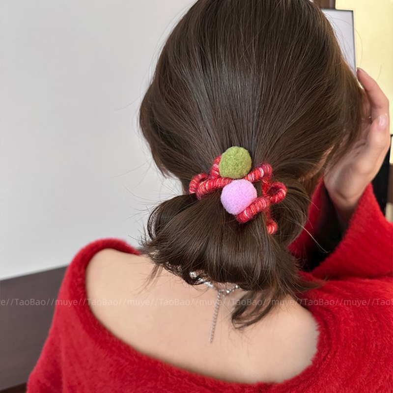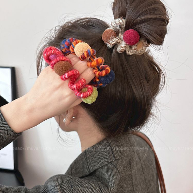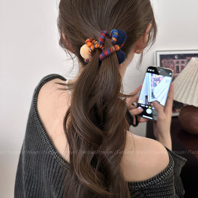 彩虹软糖~秋冬毛绒高弹力电话线发圈女2025新款甜美发绳丸子头绳