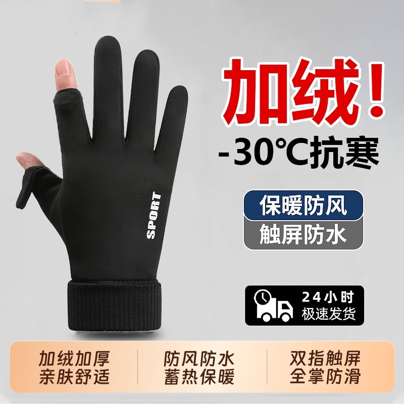 麂皮绒保暖手套男女秋冬季加绒防寒骑行开车外卖半露二指半指骑车