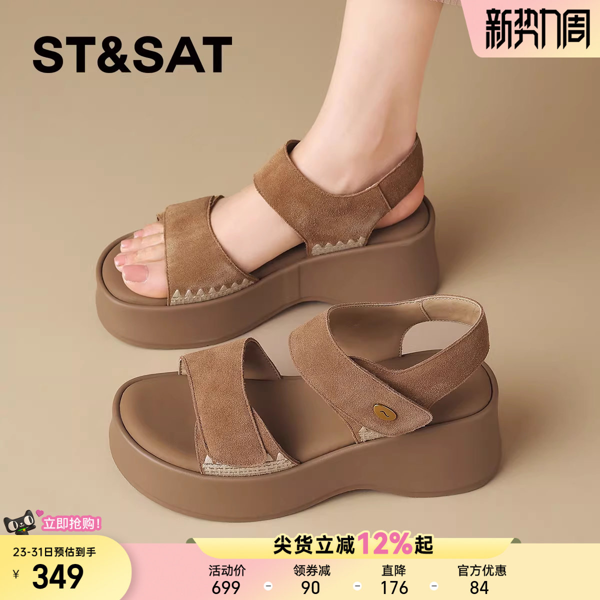 星期六真皮厚底休闲凉鞋女士2026夏季新款复古坡跟增高运动凉鞋子