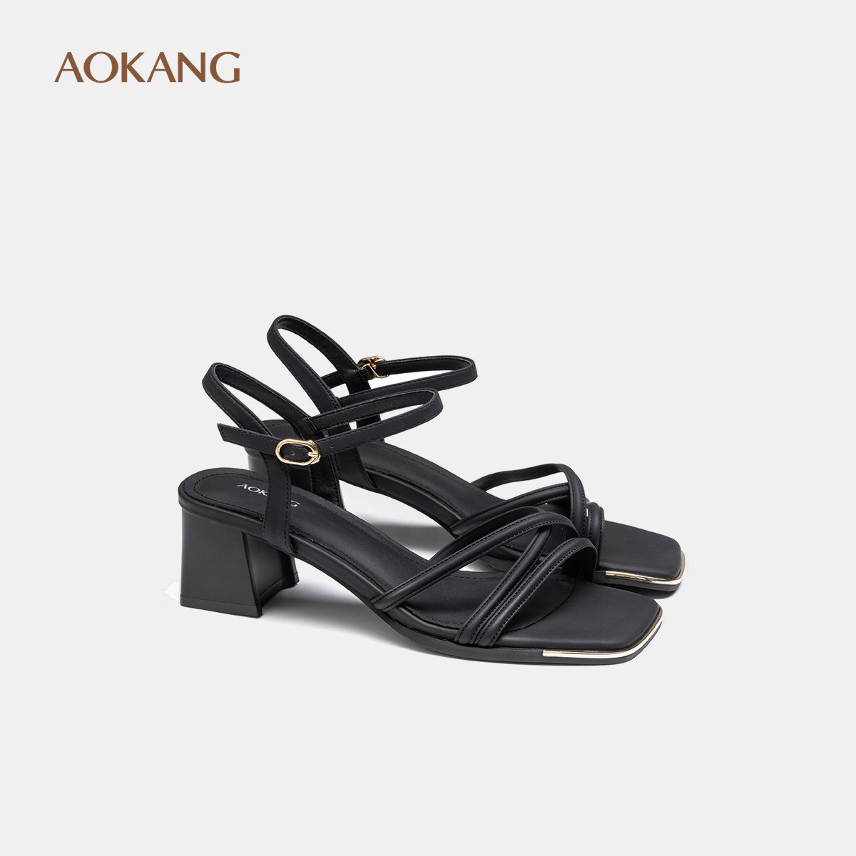 奥康 女鞋夏季凉鞋一字带气质方头OL通勤鞋增高粗跟凉拖