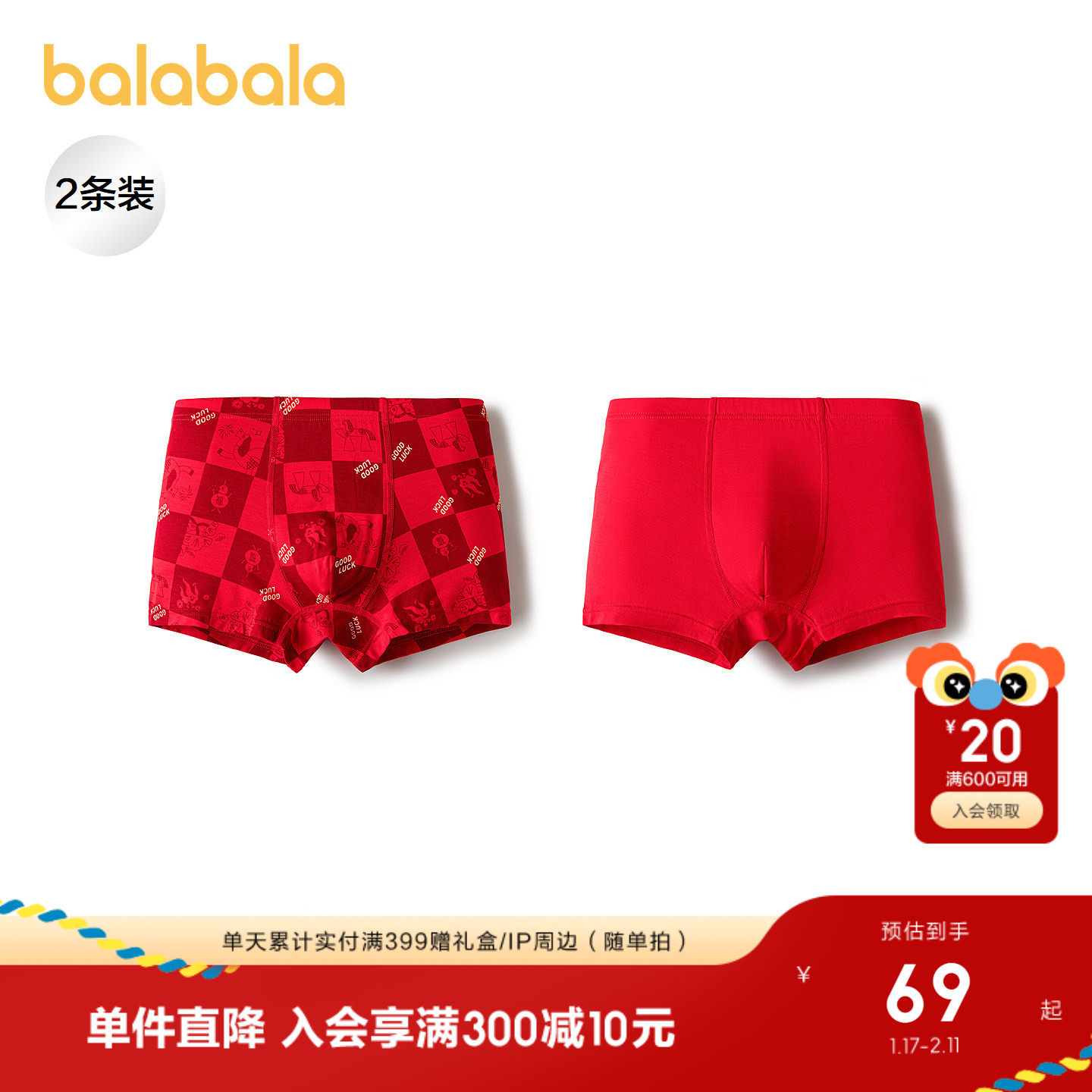 【商场同款】巴拉巴拉儿童内裤男童四角短裤平角不夹PP红色拜年服