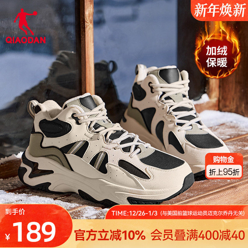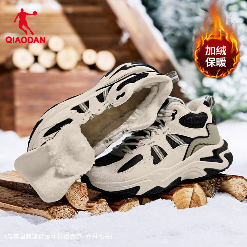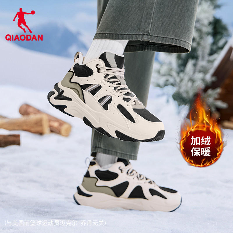 乔丹高帮加绒保暖大棉鞋男2025冬季皮面防水休闲鞋黑色户外运动鞋
