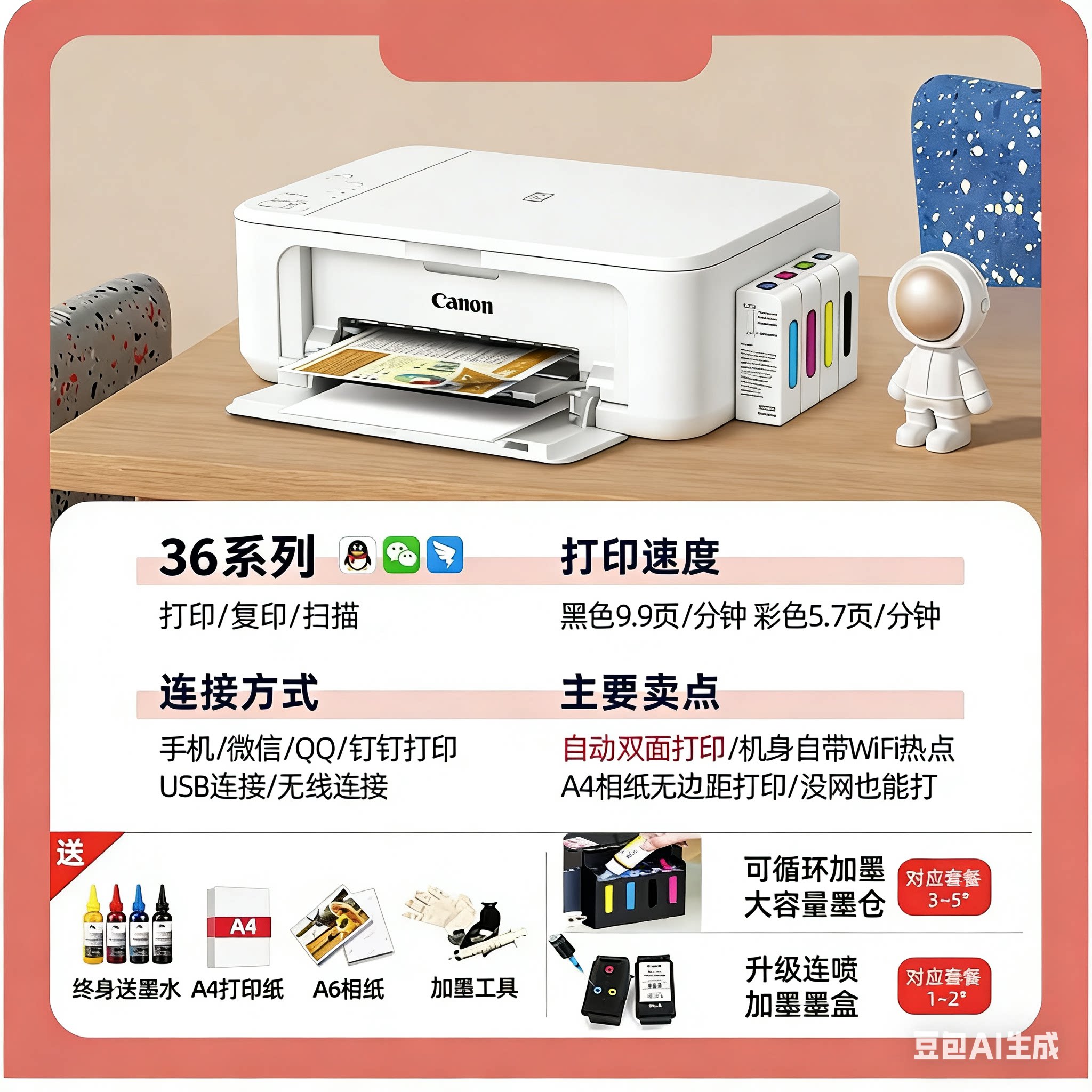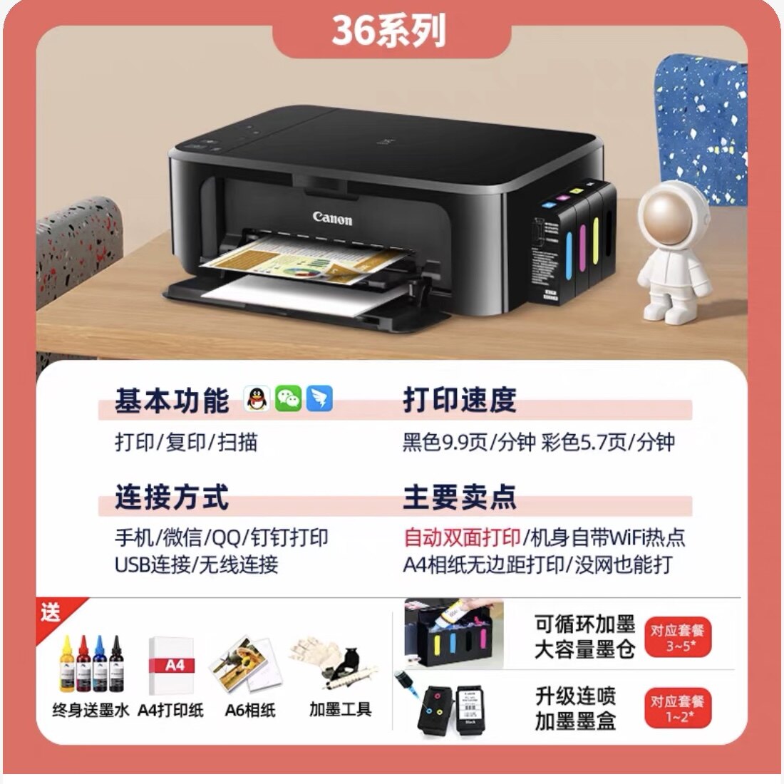 佳能3680彩色双面打印机家用小型复印扫描一体机手机无线照片墨仓