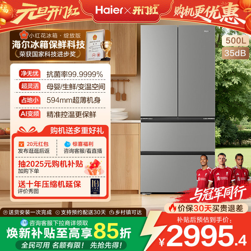 换新补贴海尔小红花500L法式多门四门一级超薄家用风冷无霜电冰箱