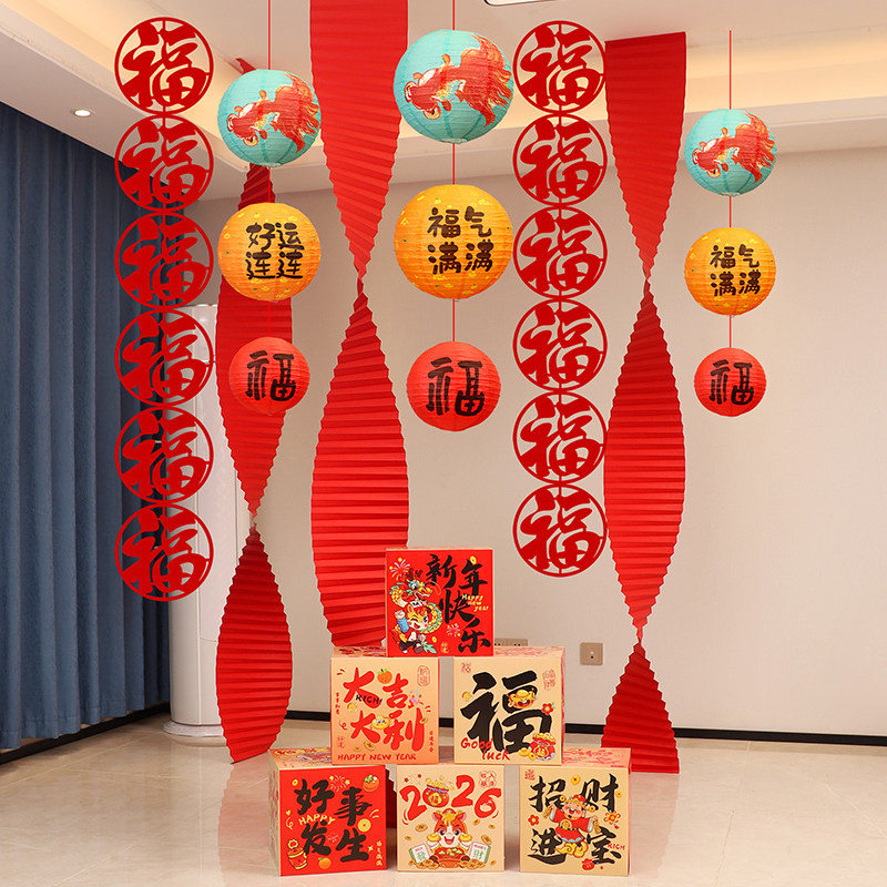 新春过年新年红色长条瓦楞纸波浪纸拉花灯笼挂饰橱窗堆盒装饰布置