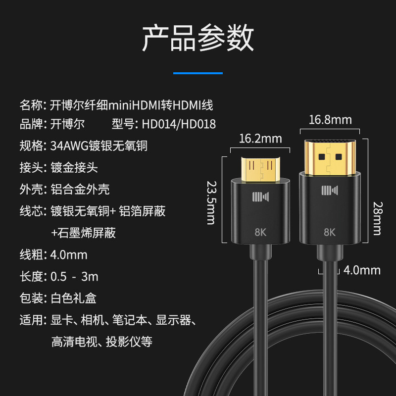 开博尔镀银miniHDMI转HDMI线2.1版4K120相机平板电视投影仪连接线