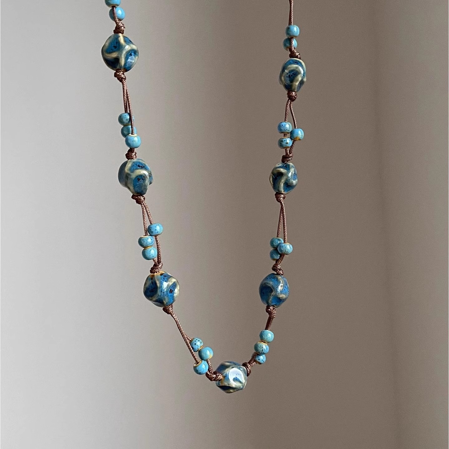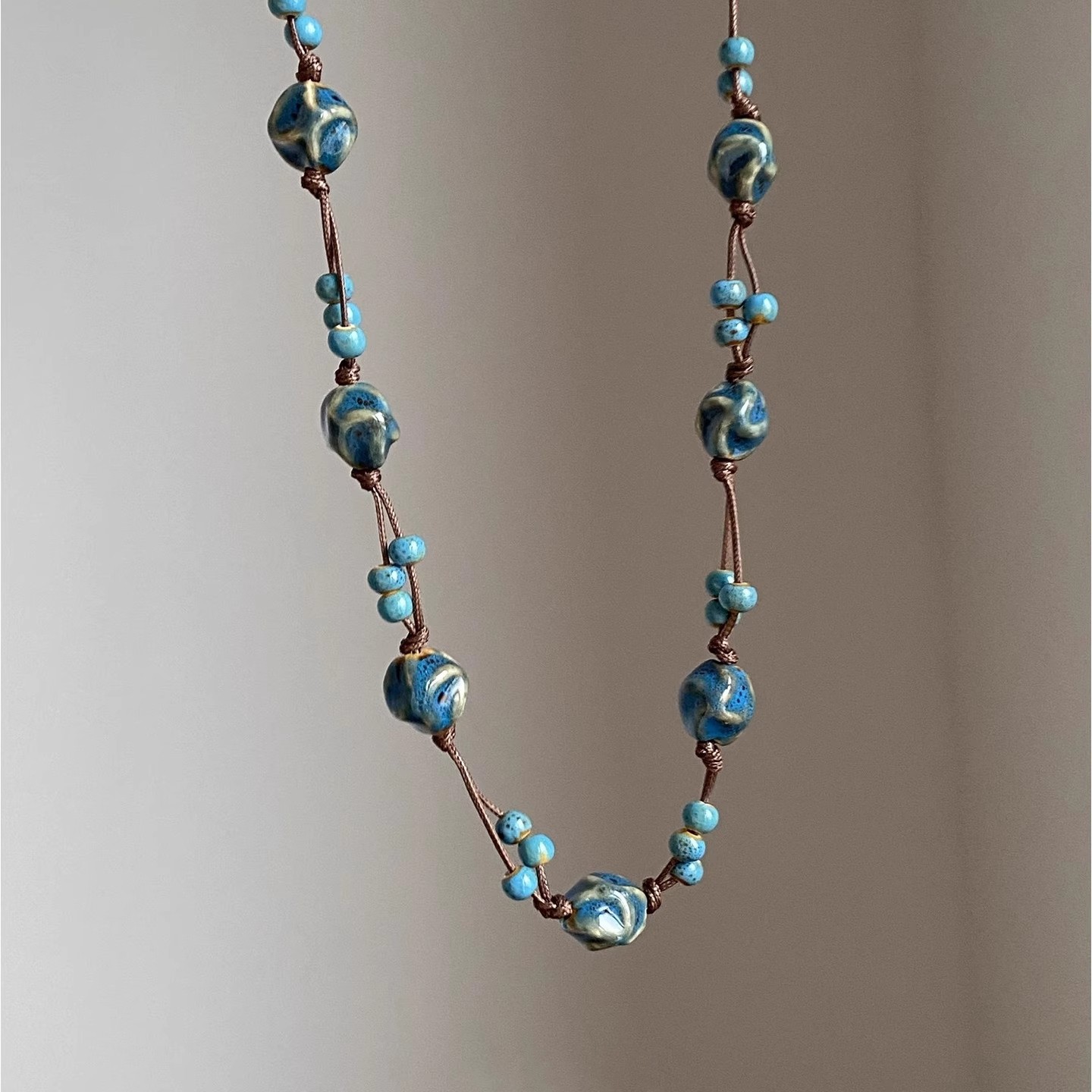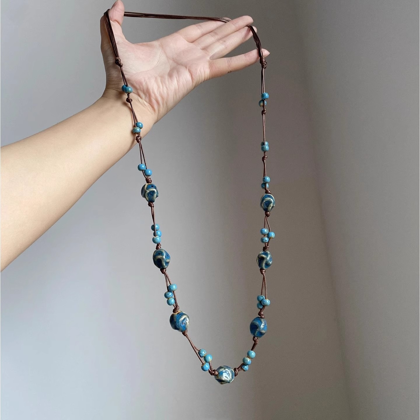 新中式国风蓝色陶瓷串珠项链女民族风编织吊坠长款毛衣链高级颈链
