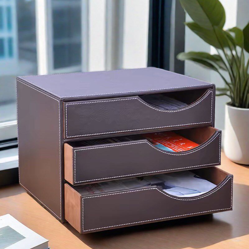 皮质桌面收纳盒a4资料架整理盒抽屉式三层文件盒办公室书桌储物柜