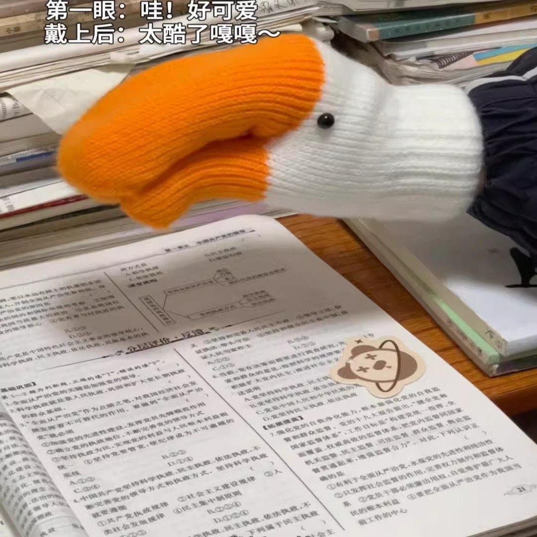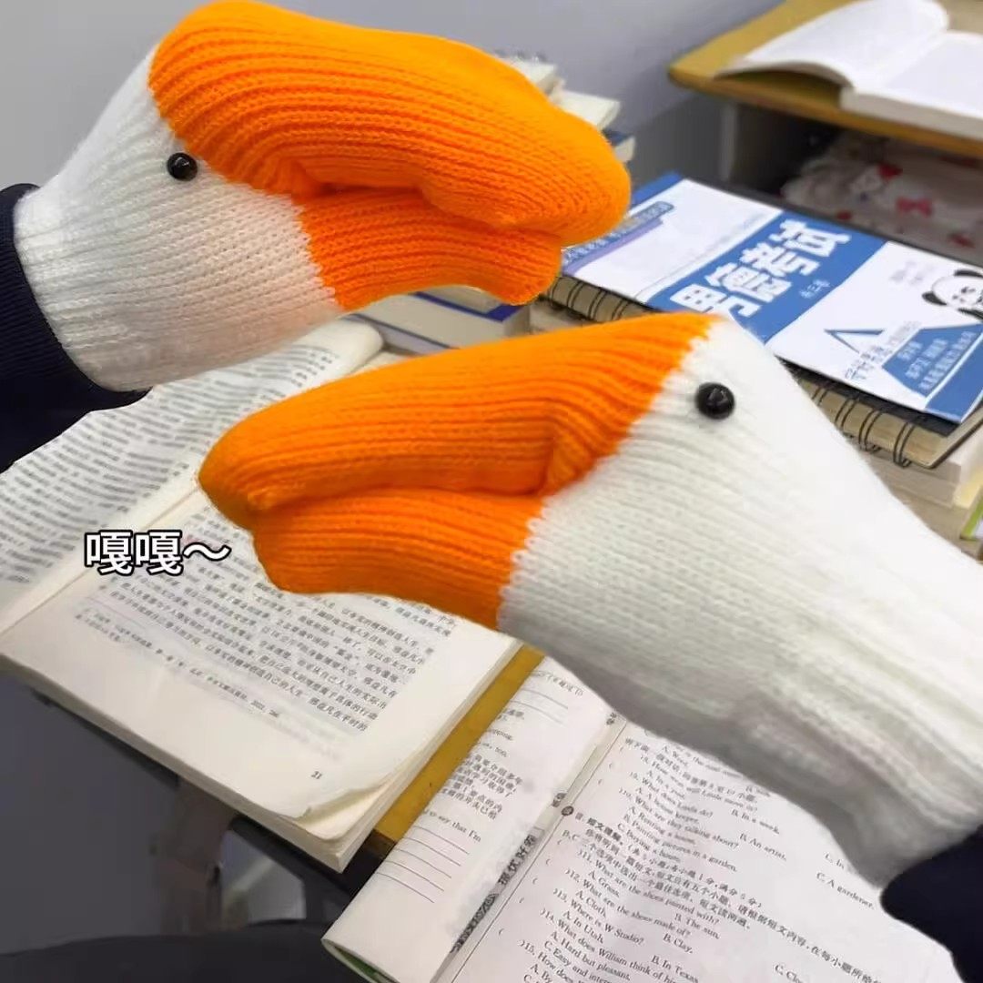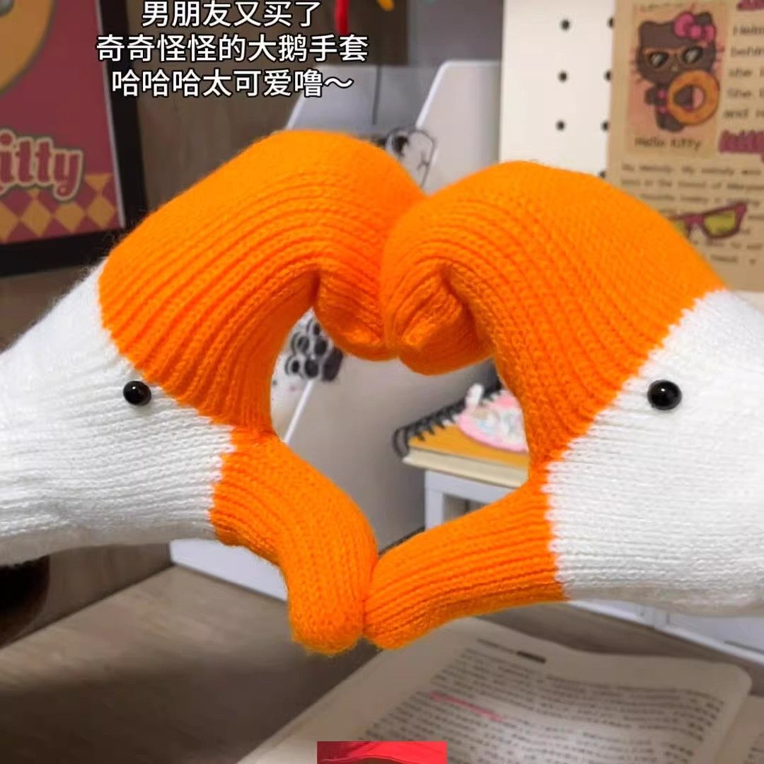 大鹅毛线连指手套女秋冬季保暖加绒加厚防寒可爱情侣学生创意搞怪