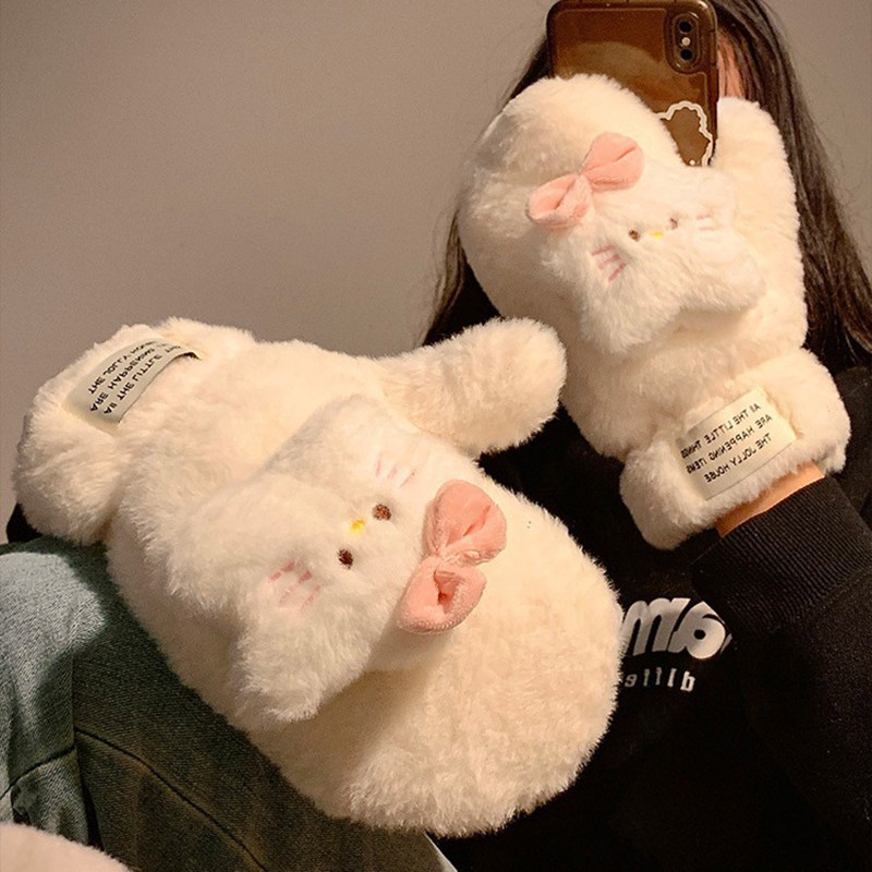 mikko联名可爱卡通猫咪毛绒手套女冬季翻盖半指触屏加厚骑行保暖
