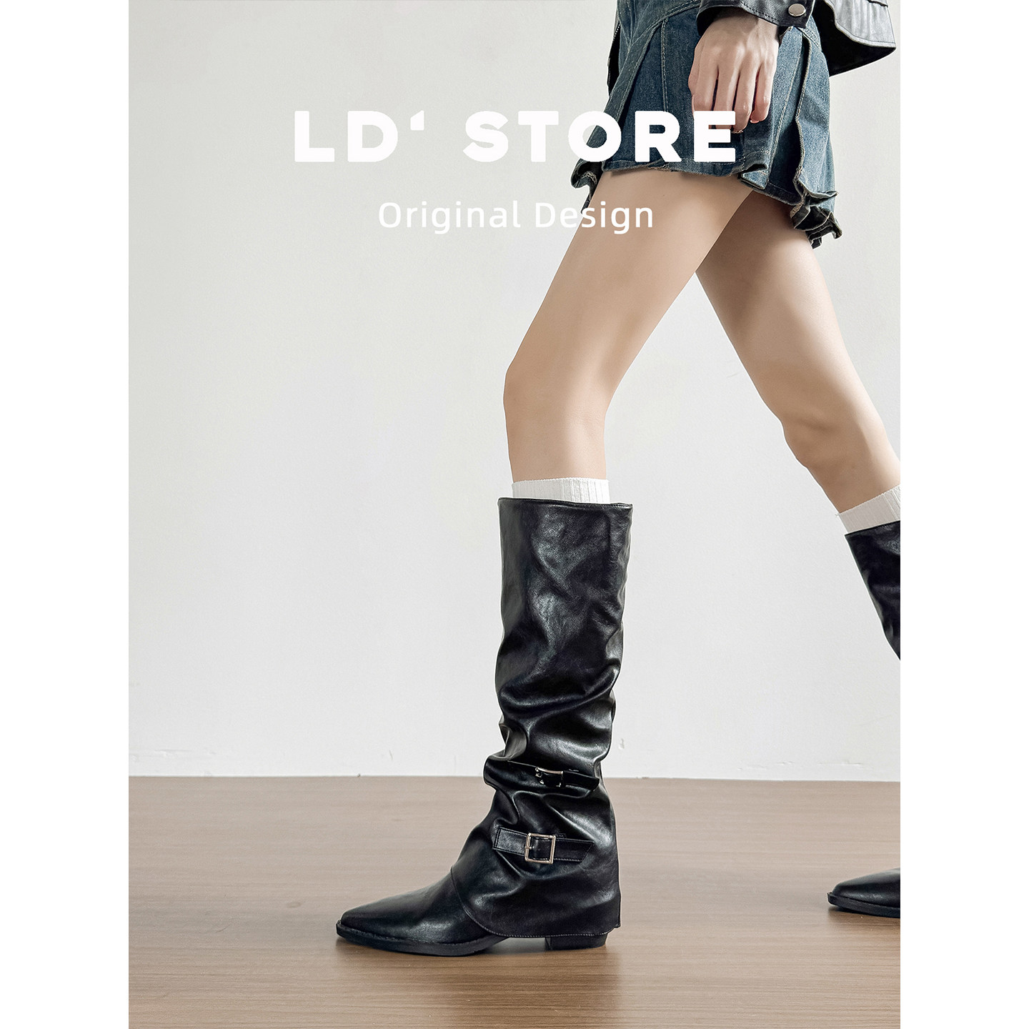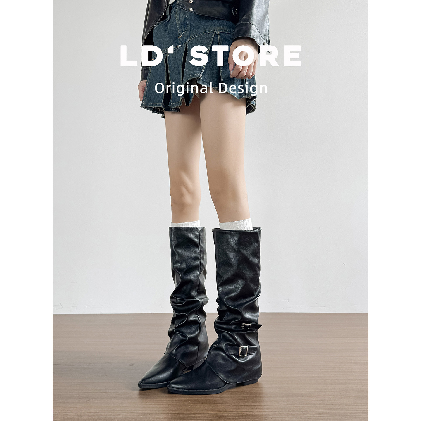 真皮~复古粗跟褶皱堆堆长靴秋内增高美拉德长筒靴西部牛仔骑士靴