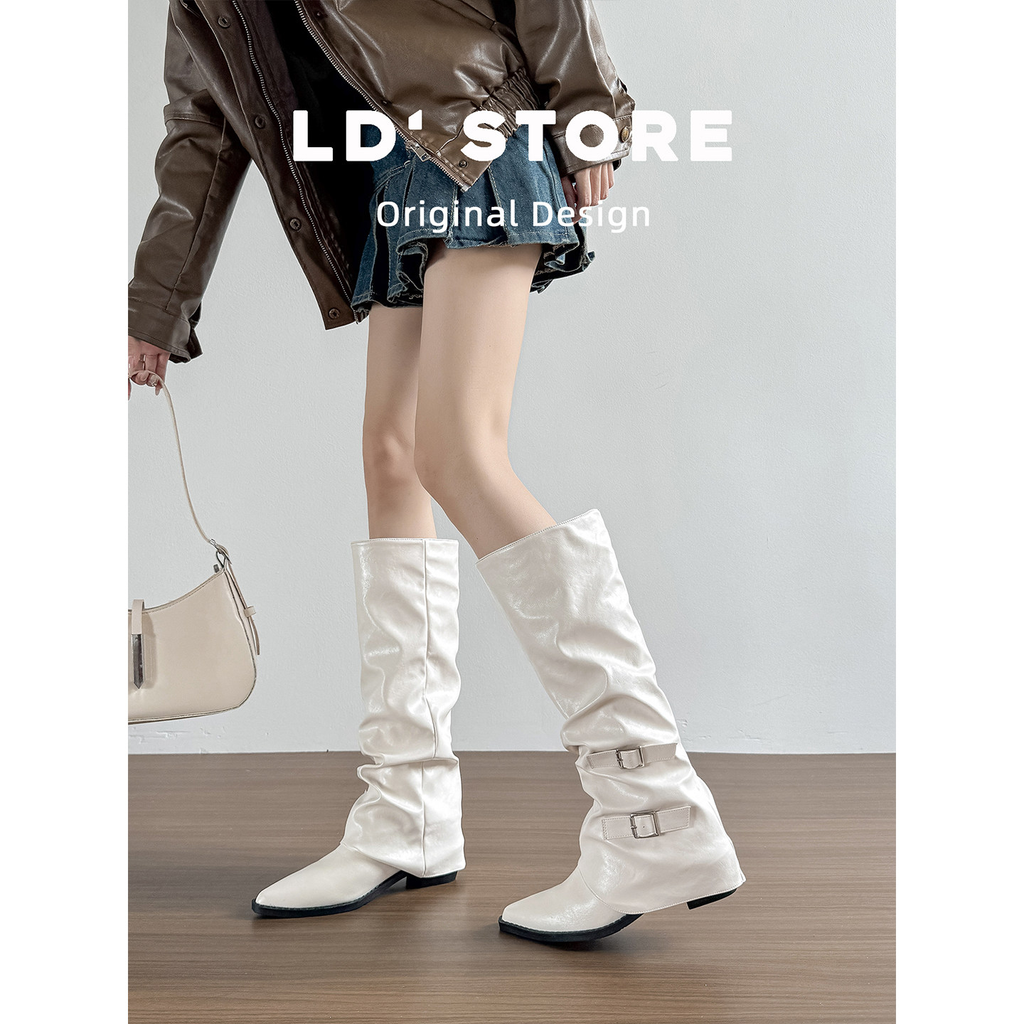 真皮~内增高粗跟骑士靴女秋冬西部靴高筒复古显瘦褶皱堆堆靴长靴