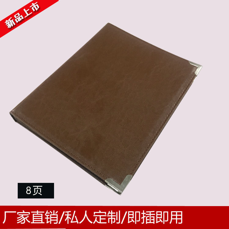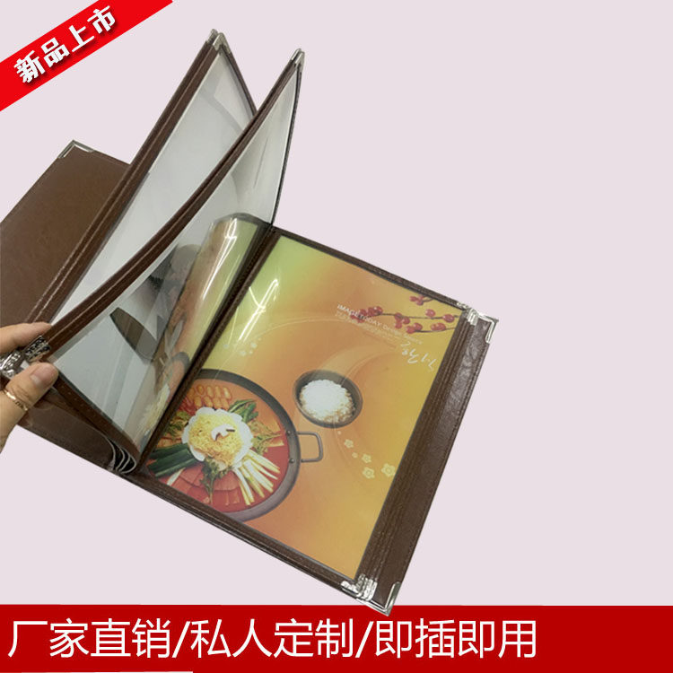 高档棕色皮革封面PVC西式8页16面透明菜谱本定制A4活页菜单夹餐