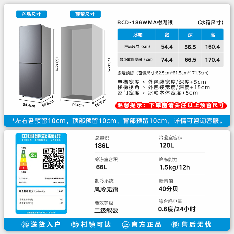 美的186L风冷无霜双门两门家用电冰箱小户型节能低噪冷藏冷冻租房