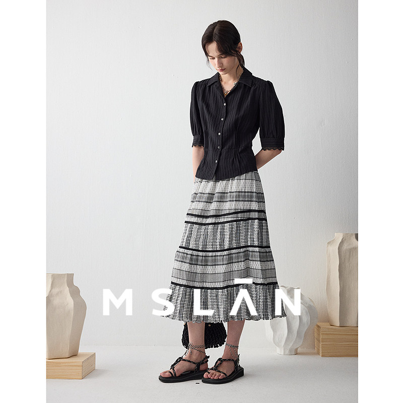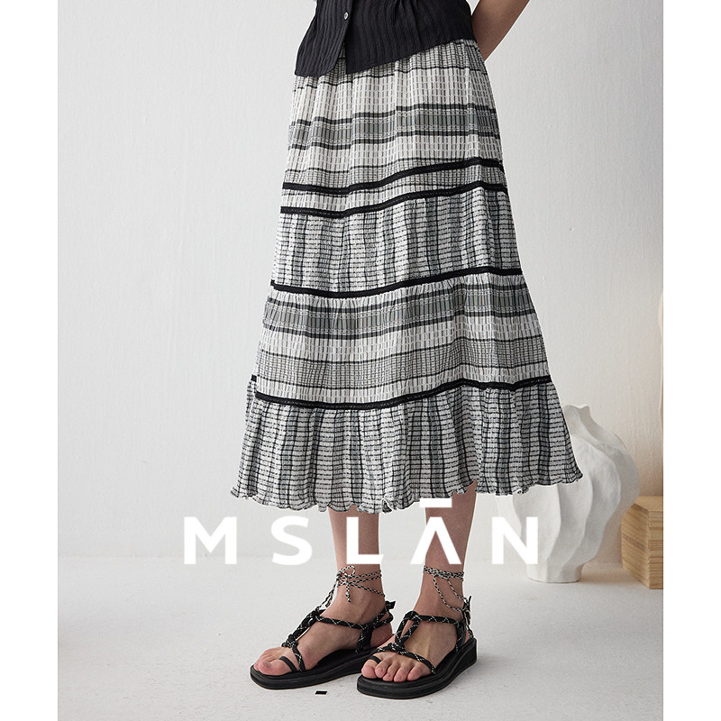 MSLAN艺术系女孩 透气肌理长裙A字拼接撞色飘逸半身裙MECV8202