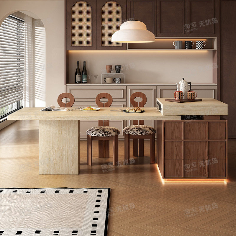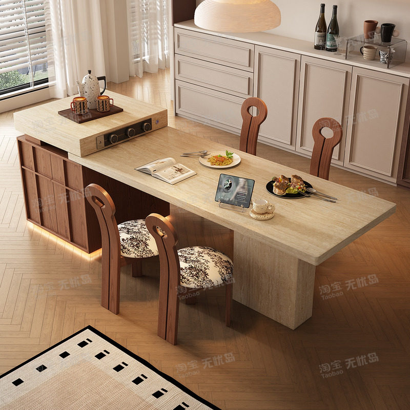 中古风岛台一体餐桌家用可伸缩高级洞石岩板导台厨房原木风倒台