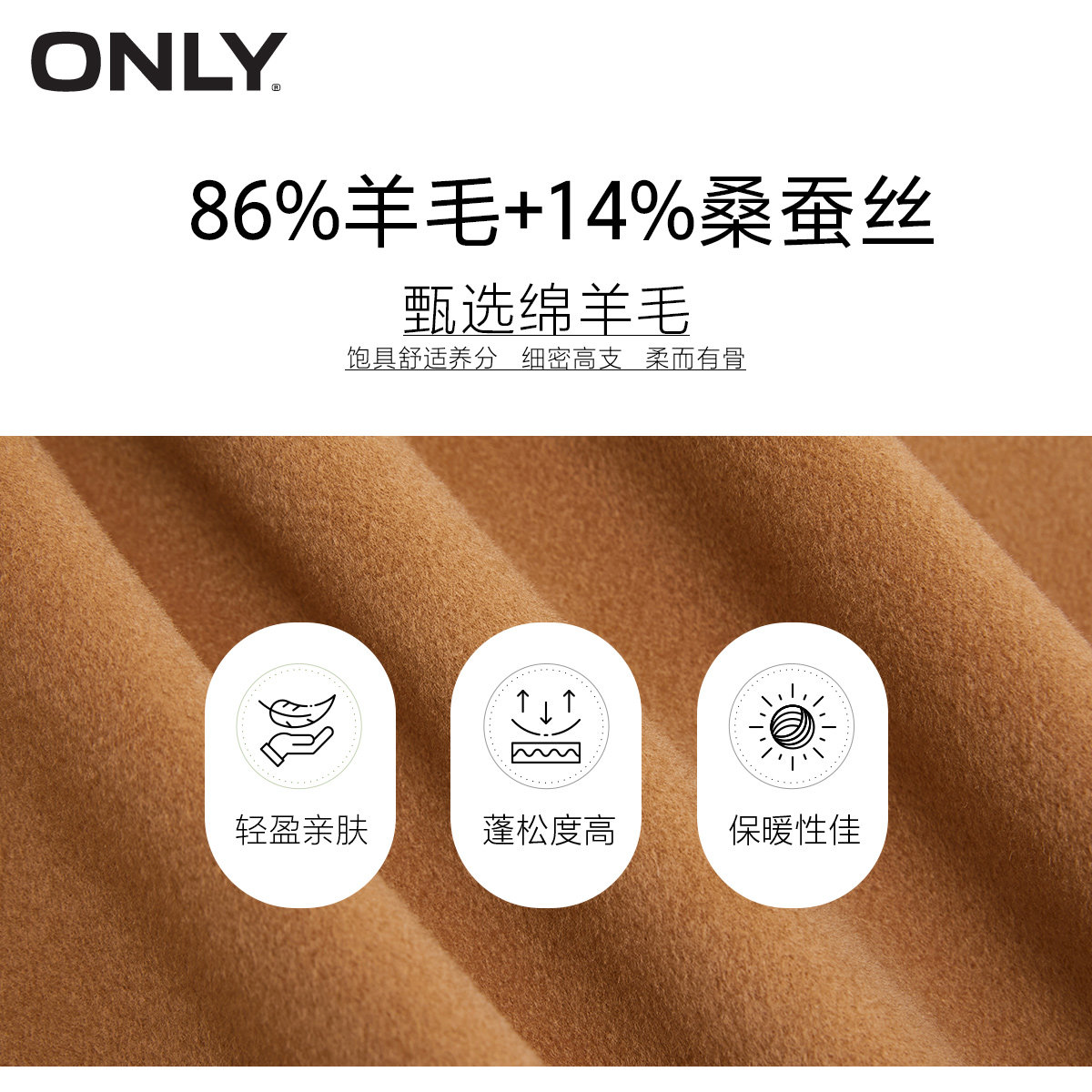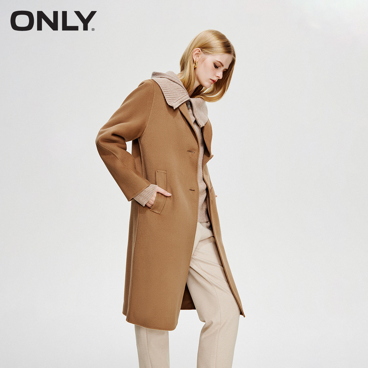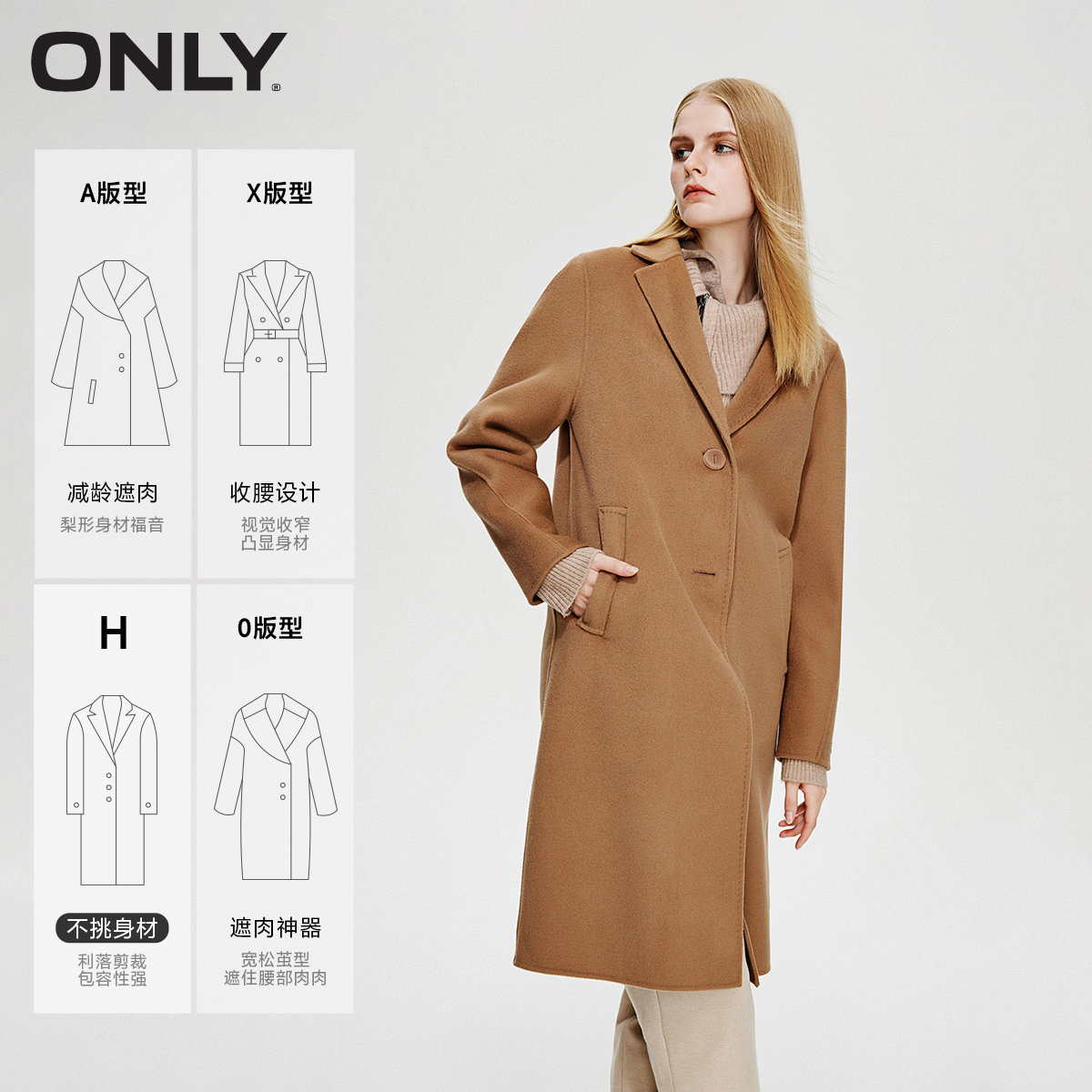 ONLY冬季双面呢平驳领桑蚕丝绵羊毛中长款毛呢大衣外套女