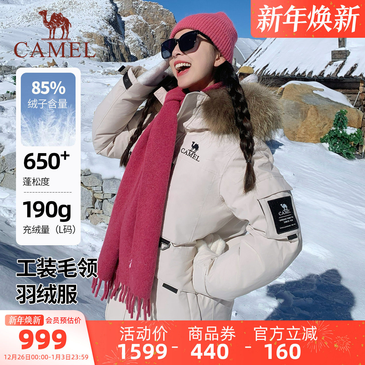 骆驼女装毛领羽绒服2025冬季防寒防风加厚保暖三防工装外套