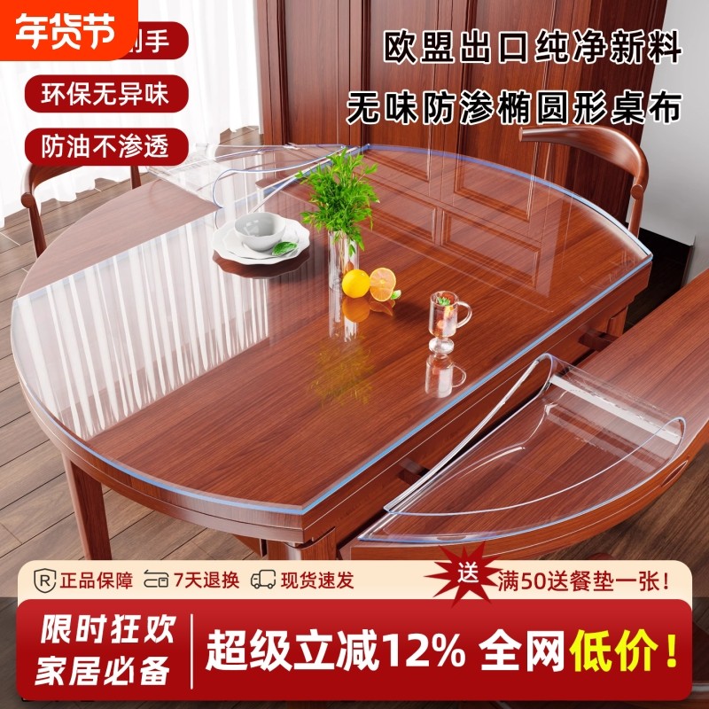 折叠椭圆形餐桌垫透明pvc桌布软玻璃伸缩大圆桌垫防油免洗水晶板