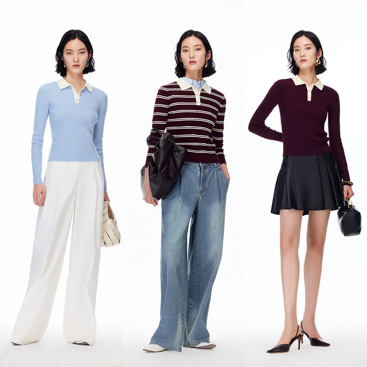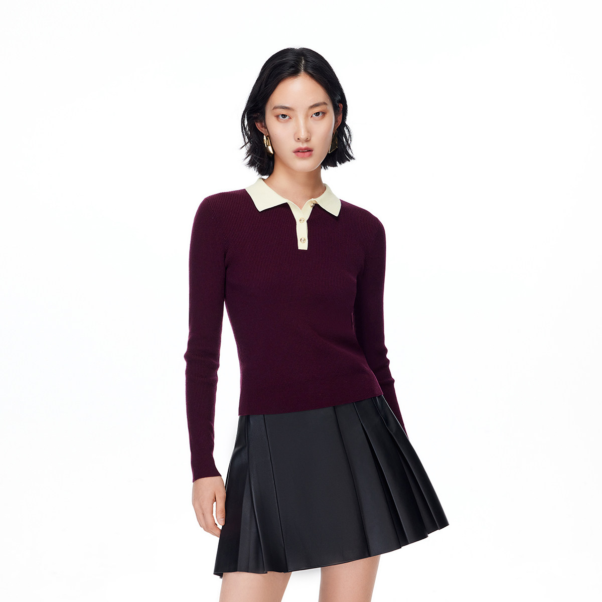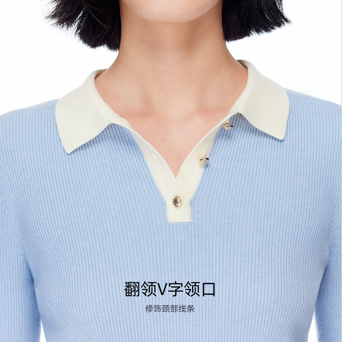 翻领v字领口 修饰颈部线条;撞色设计
