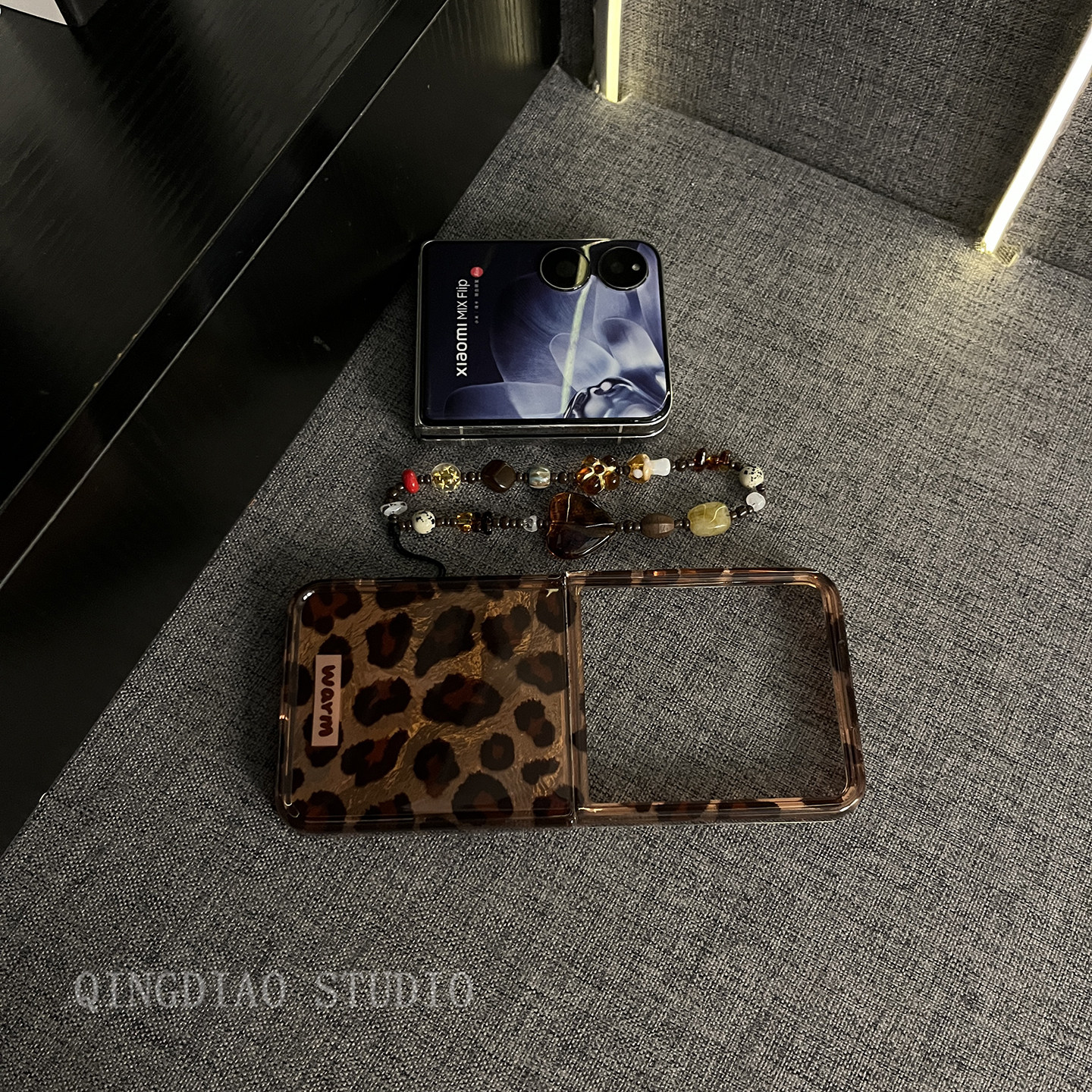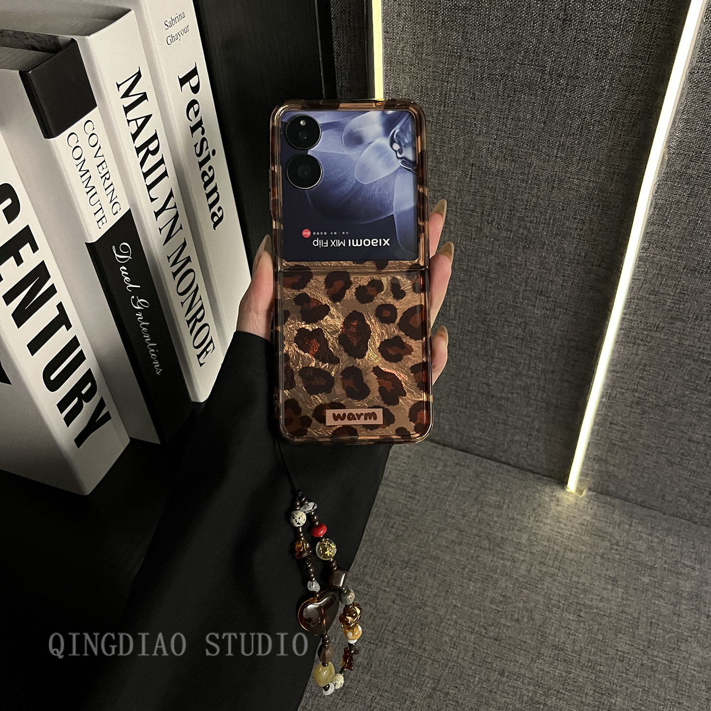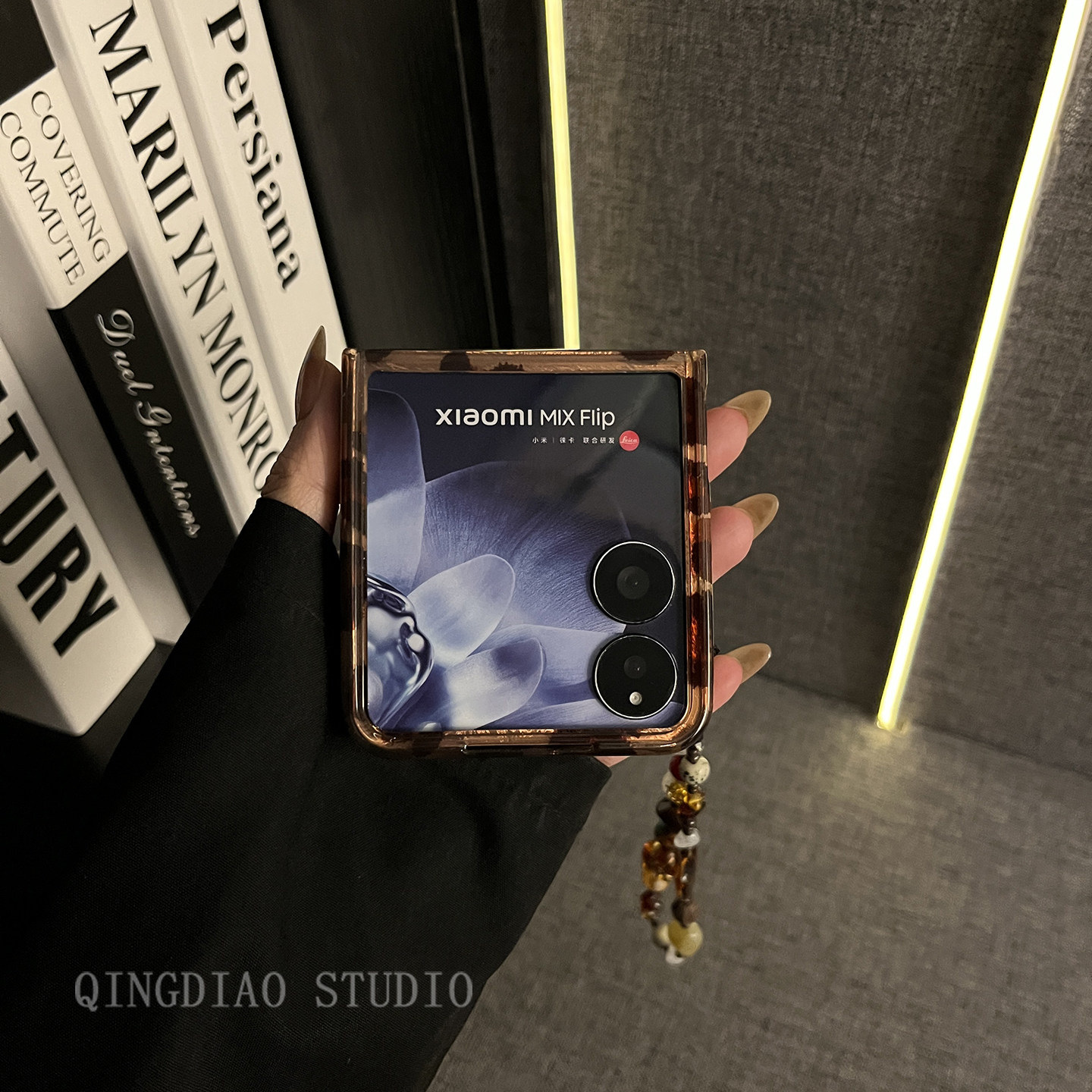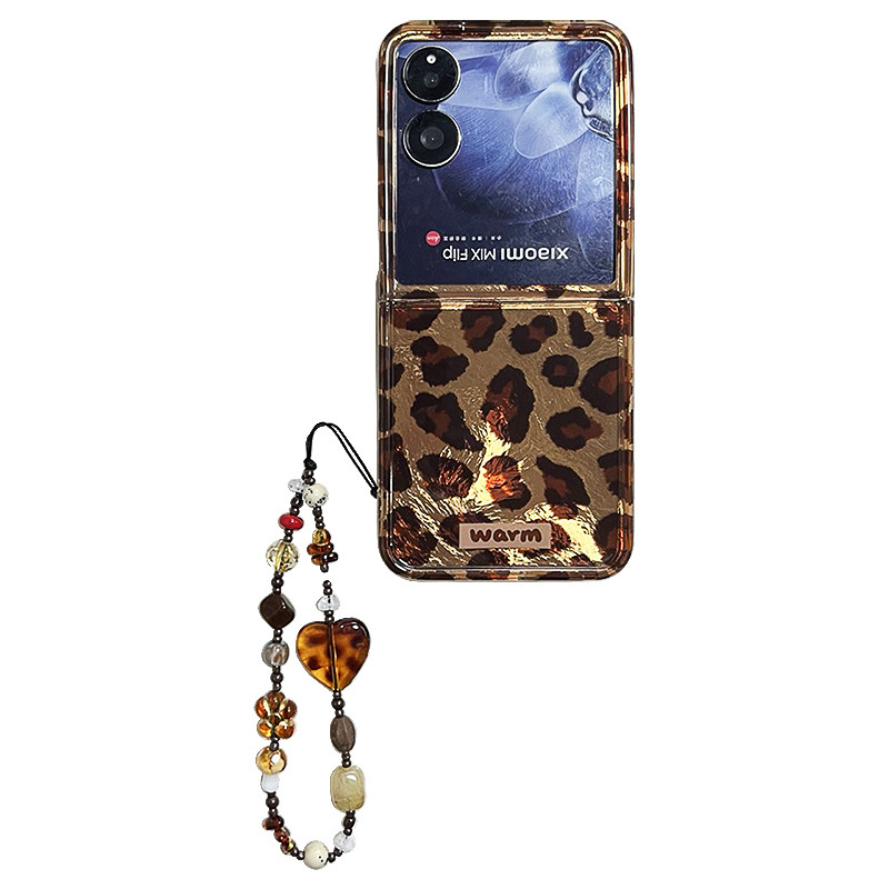 轻调 欧美风个性棕豹纹琥珀手机链适用于小米mixflip手机壳新款MIX限量款flip折叠屏小众辣妹翻盖防摔保护套