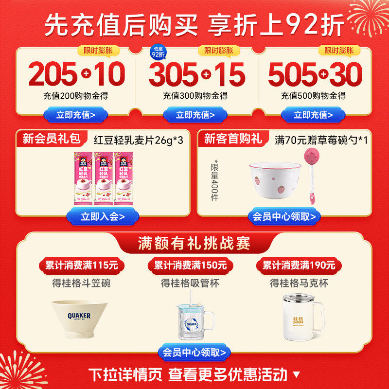 桂格即食燕麦片1478g*3袋谷物冲泡免煮营养早餐代餐饱腹冲饮麦片