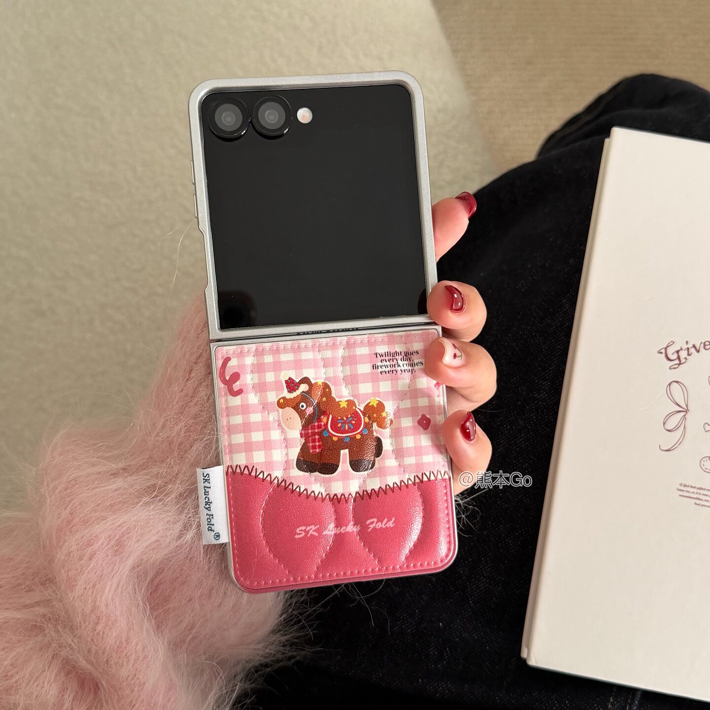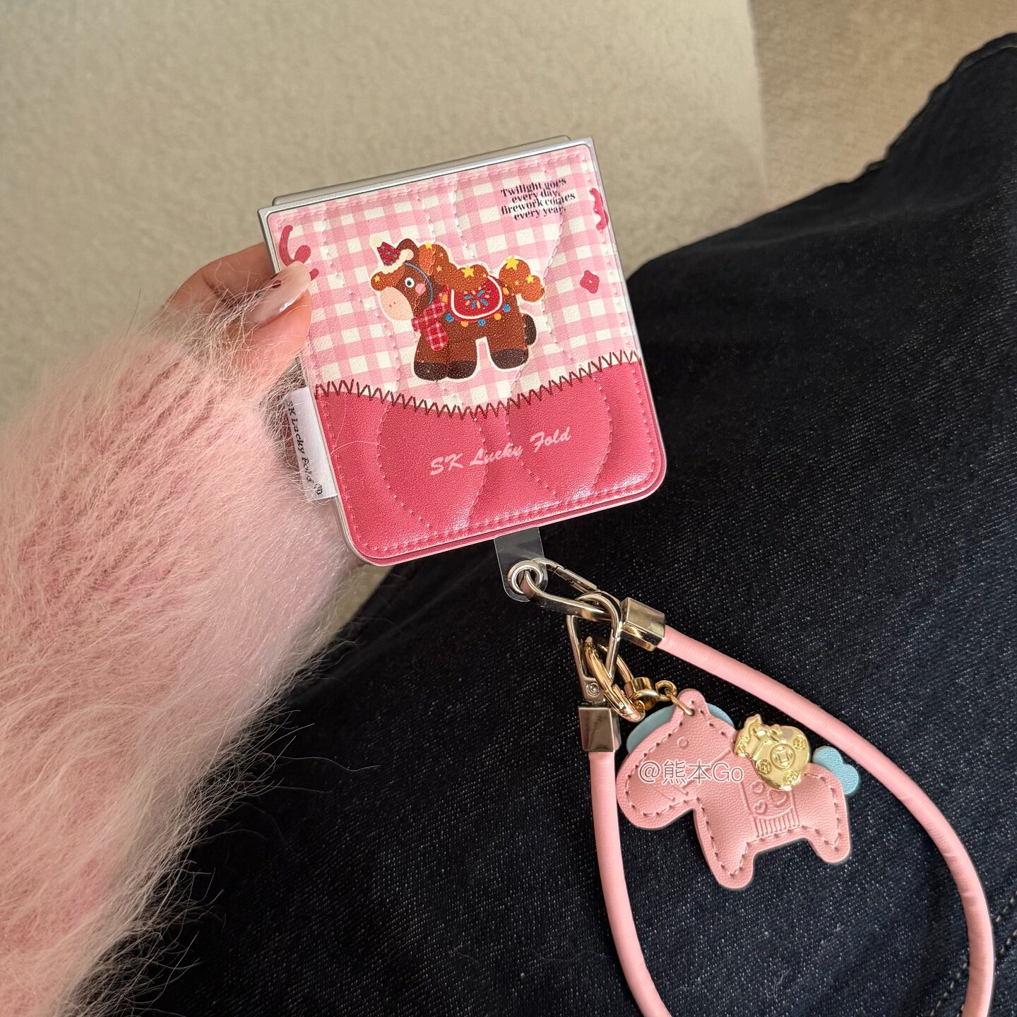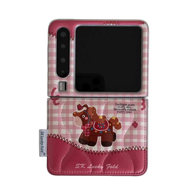 粉色可爱格纹小马适用华为purax手机壳小米Mixflip2鼓包皮质保护套三星ZFLIP7/6/5挂饰皮绳n3flip荣耀Vflip2