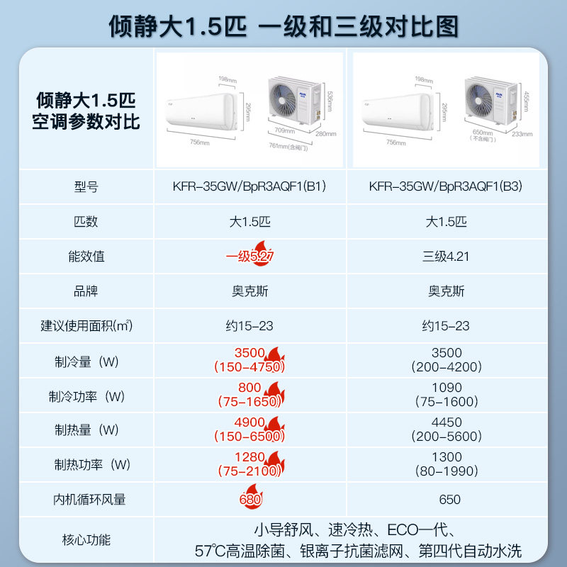 奥克斯空调大1.5匹p一级变频挂机省电大3匹立式柜机2p旗舰