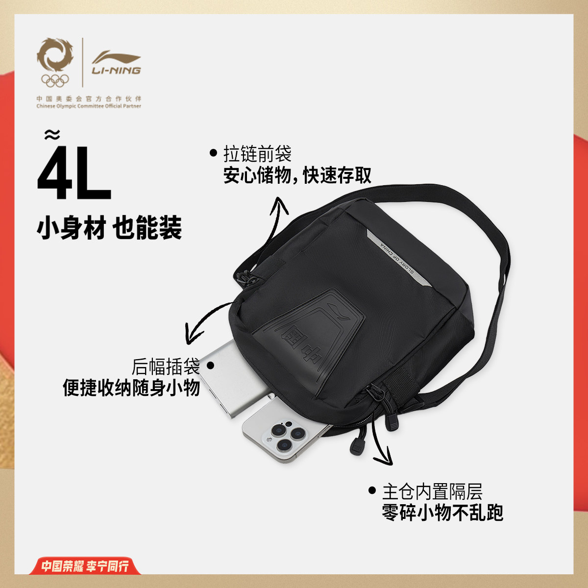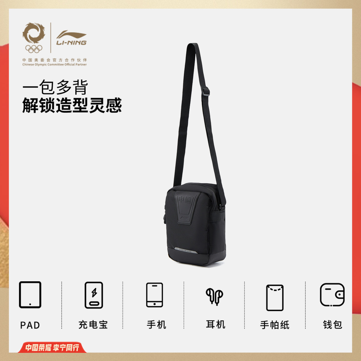 李宁荣耀系列斜挎包男包女包2026新款官方正品户外休闲单肩运动包