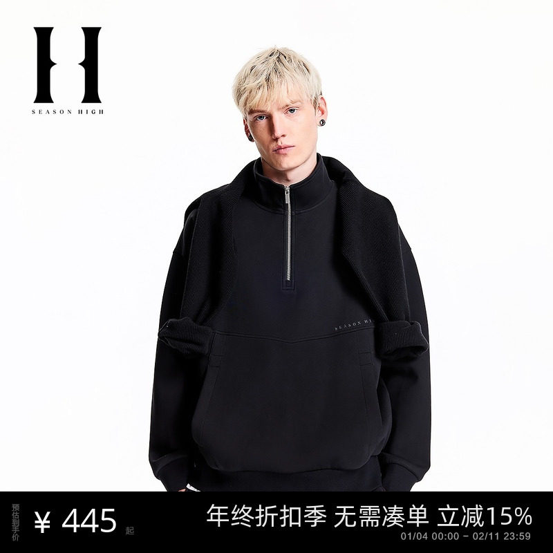 SEASON HIGH秋冬黑色简约舒适精致字母刺绣时尚出街立领卫衣男装