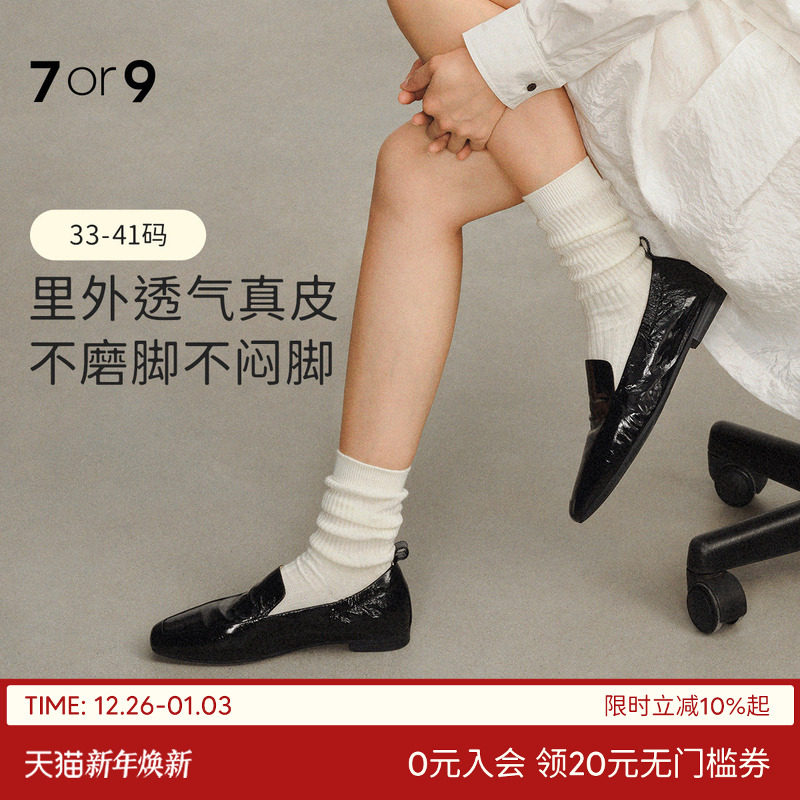 7or9黑金可颂豆豆鞋女新方头乐福小皮鞋平底一脚蹬休闲单鞋小床垫