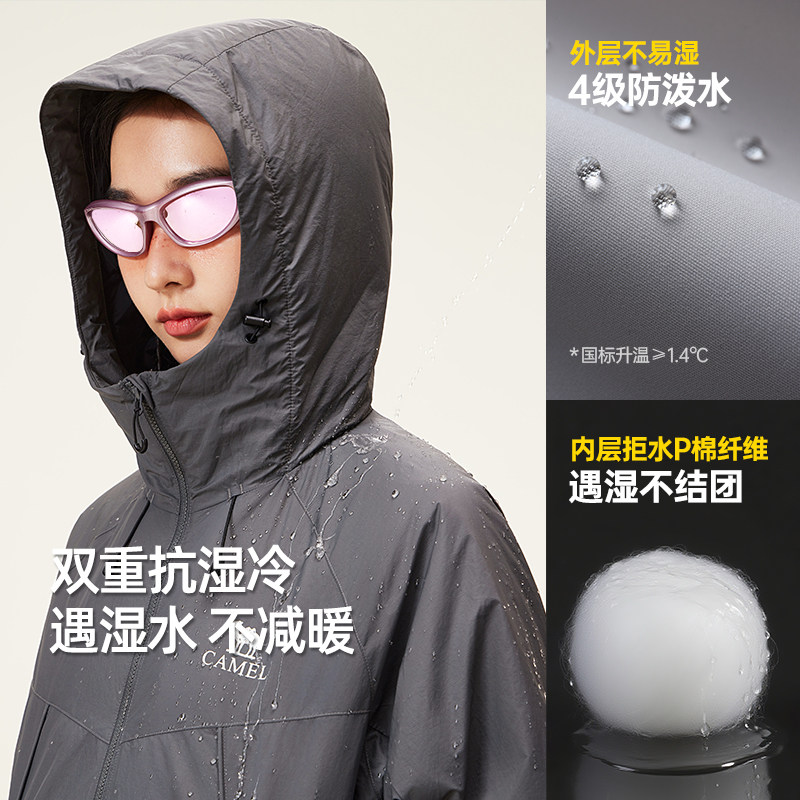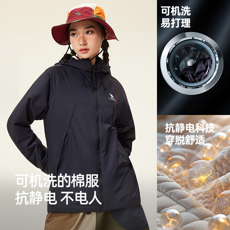 骆驼女装金标P棉服2025新款秋冬黑色连帽抗湿冷户外防风运动外套