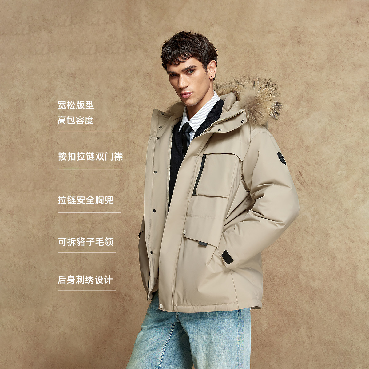 杰克琼斯奥特莱斯男装羽绒服冬季刺绣可拆毛领连帽宽松保暖外套