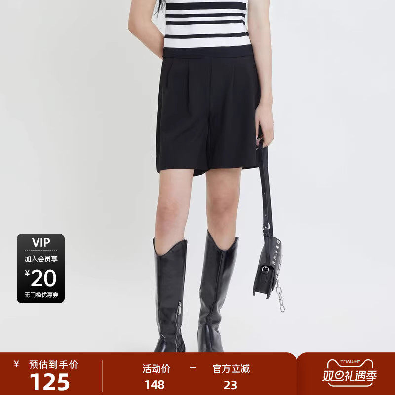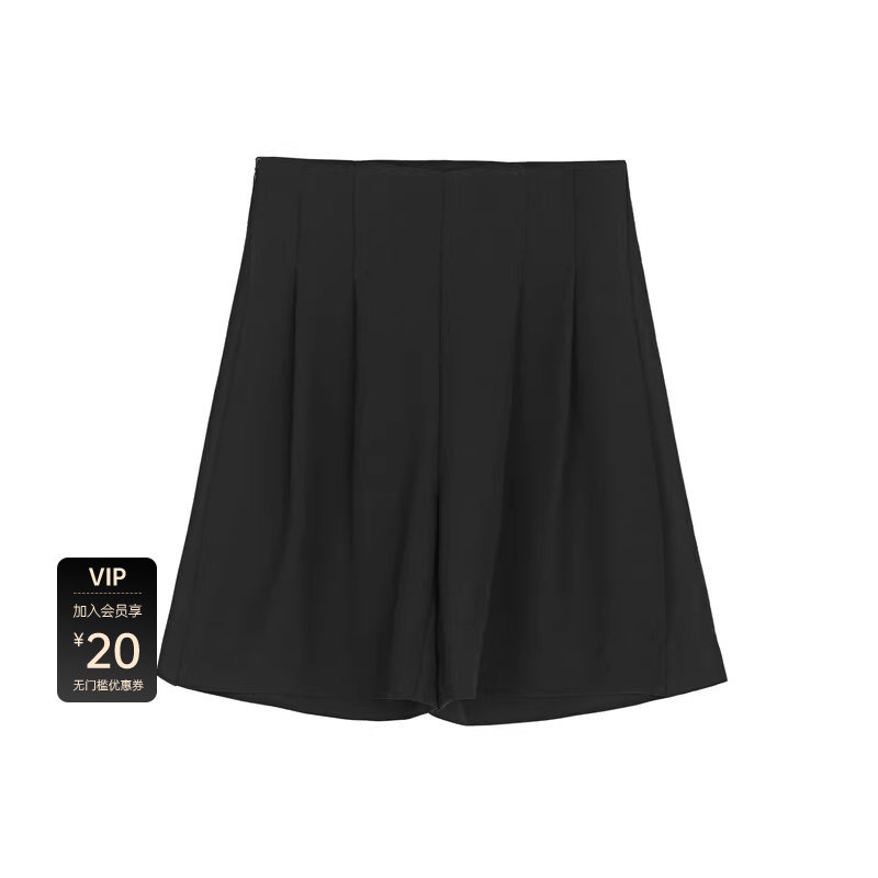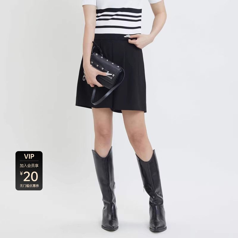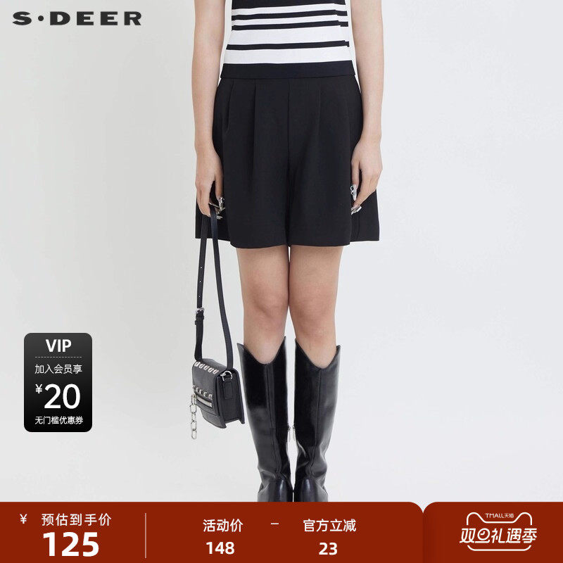 sdeer圣迪奥女装复古高腰压褶A字黑色短裤S24280904