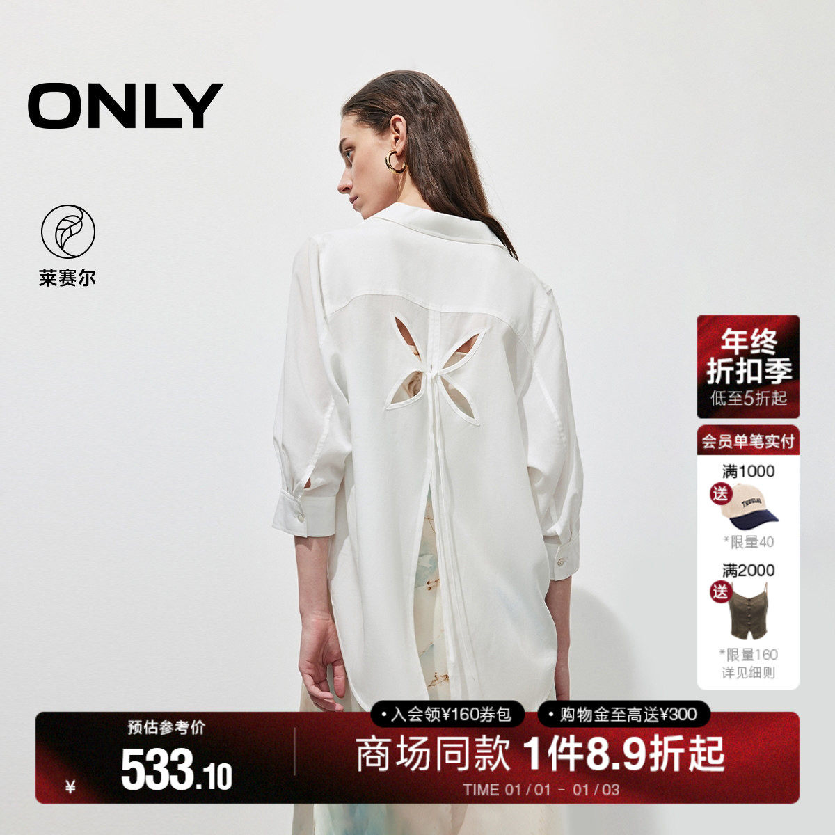 ONLY2025夏季新款轻薄蝴蝶镂空淡人白色通勤翻领七分袖宽松衬衫女