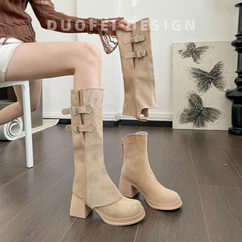 裸色高跟靴子长靴女秋冬季2025新款爆款高筒可拆卸两穿短靴瘦瘦靴