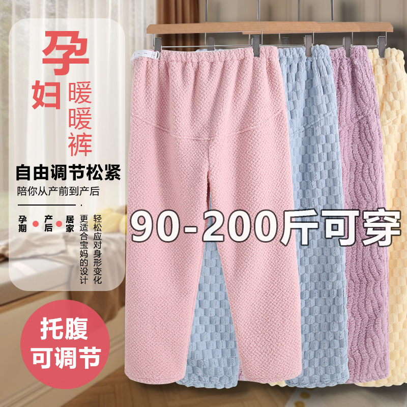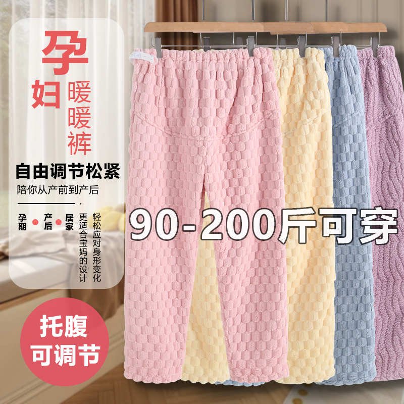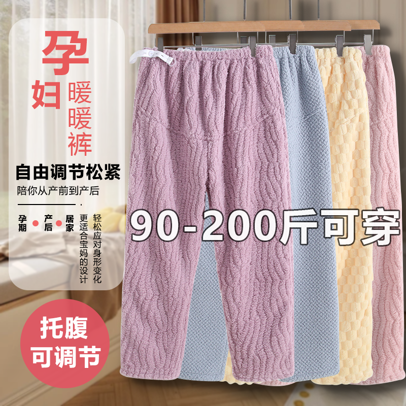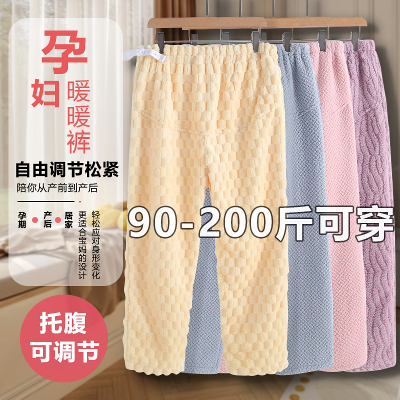 托腹睡裤孕妇秋冬款宽松大码200斤可调节珊瑚绒月子家居裤暖暖裤