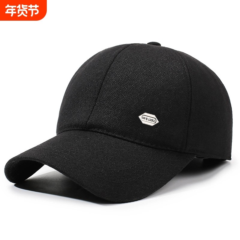 男士帽子冬季中老年爸爸棒球帽加绒厚保暖护耳鸭舌帽棉帽黑色毛呢