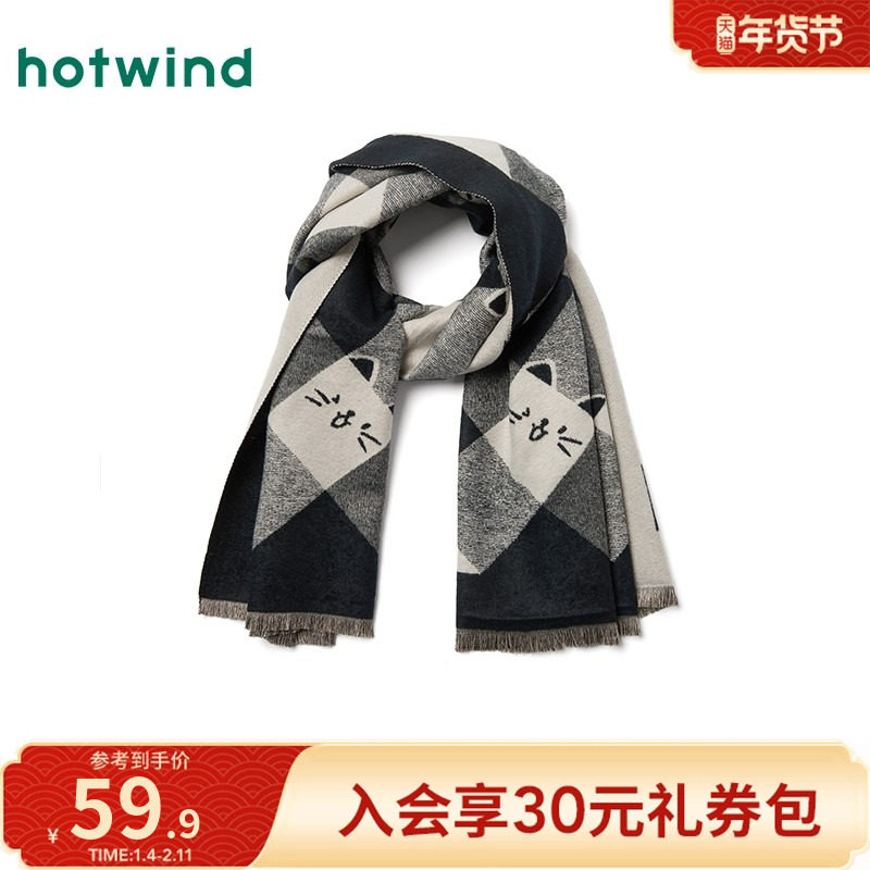 热风2025年冬季新款女士格纹小猫梭织围巾可爱学院风