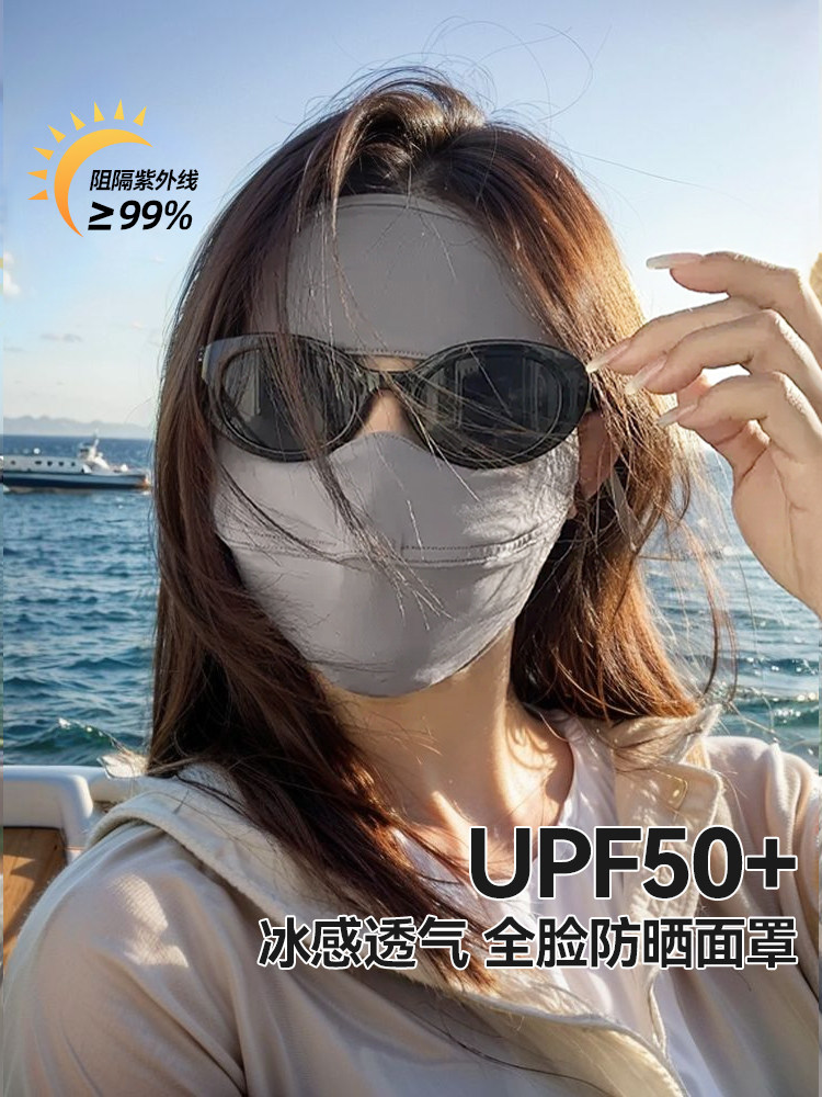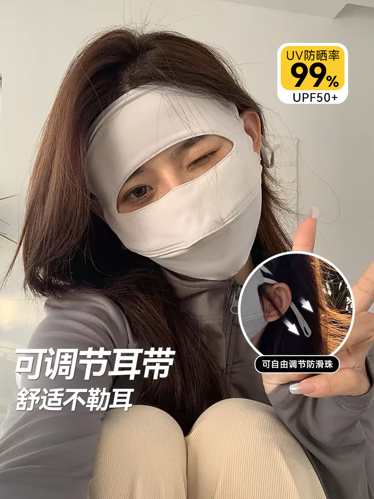 防晒面罩女款2024全脸口罩防紫外线脸罩冰丝面纱脸比基尼额头防护