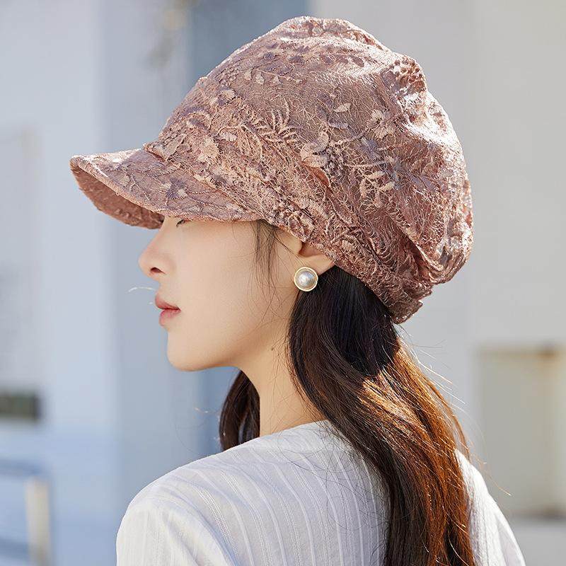 韩版蕾丝鸭舌帽薄款八角帽镂空花朵透气防晒包头遮白发女士帽子