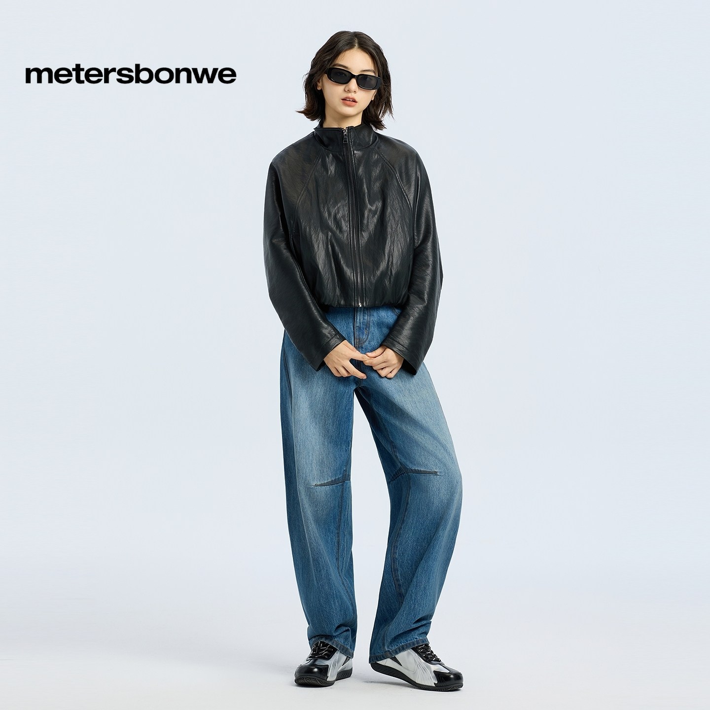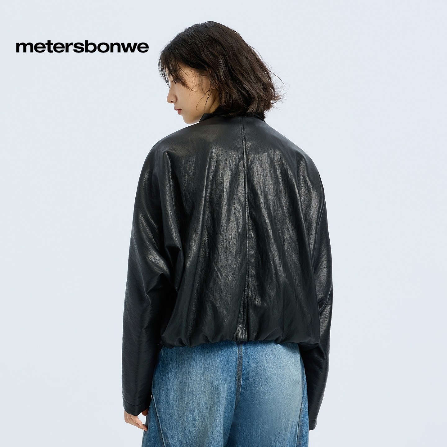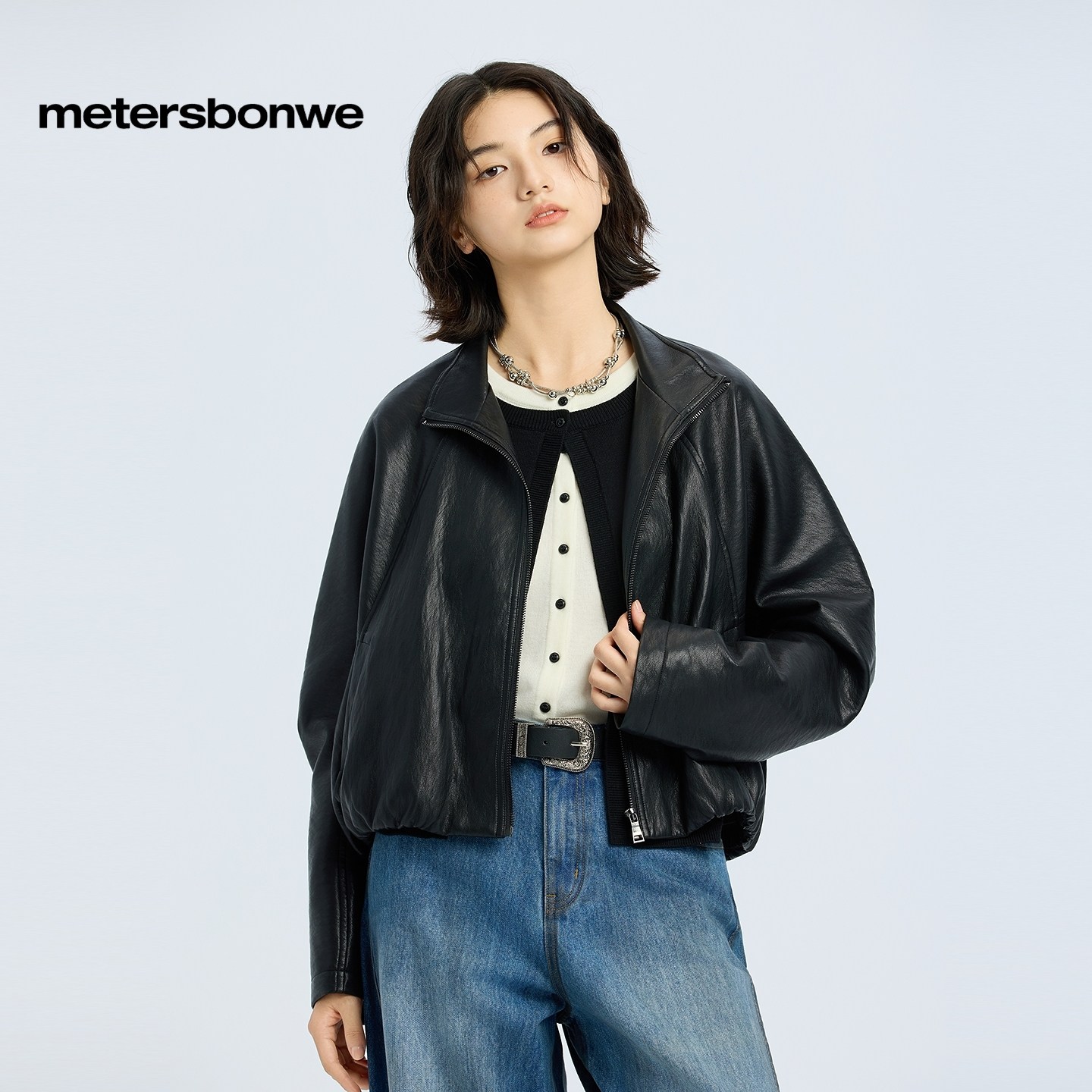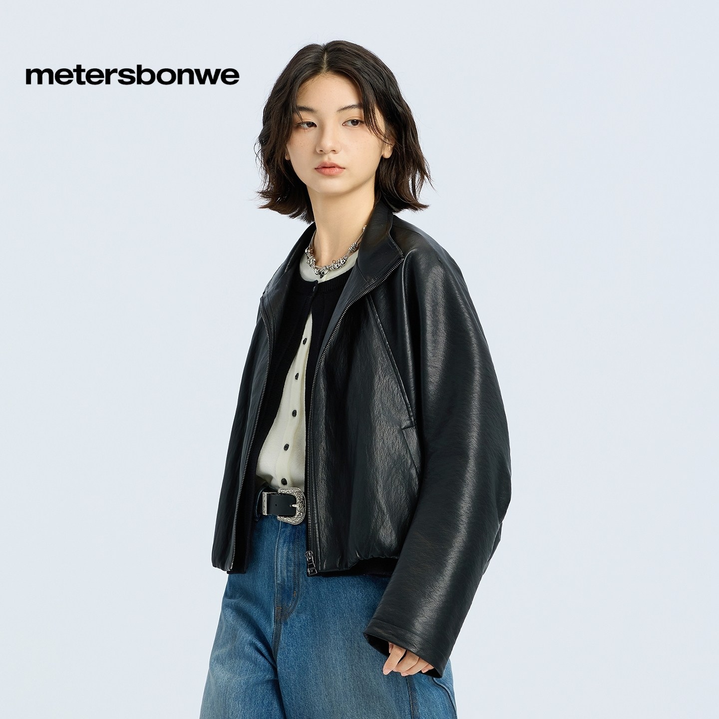 美特斯邦威夹克女士2025秋冬新款潮流PU宽松立领短款开衫机车外套