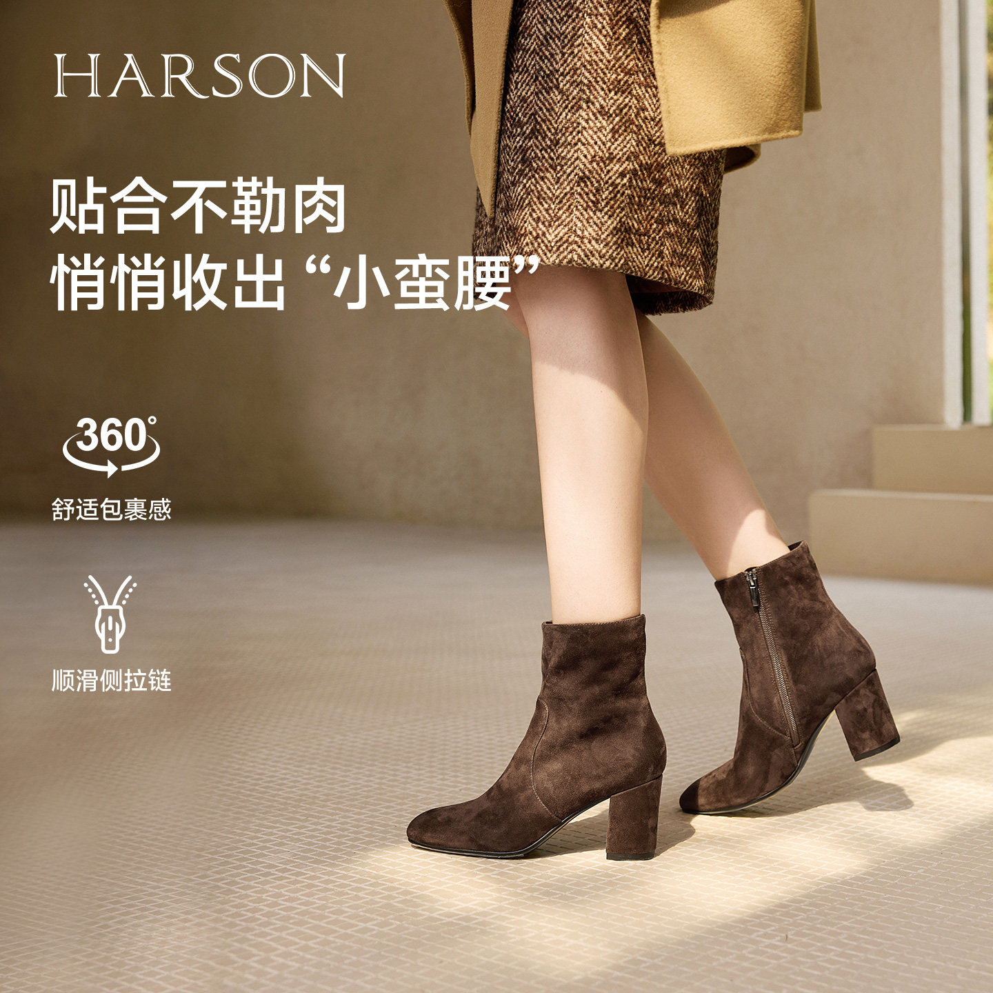 哈森/HARSON【弹力塑形家】25冬新款绒面高跟时装瘦瘦靴短靴女