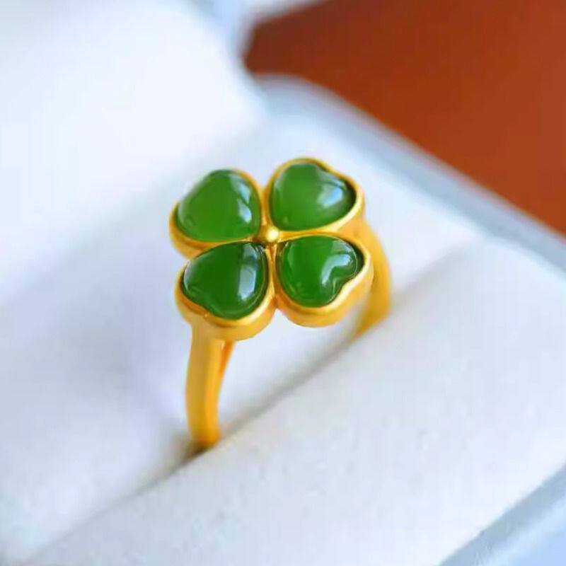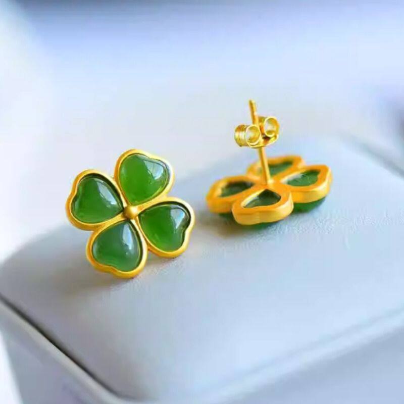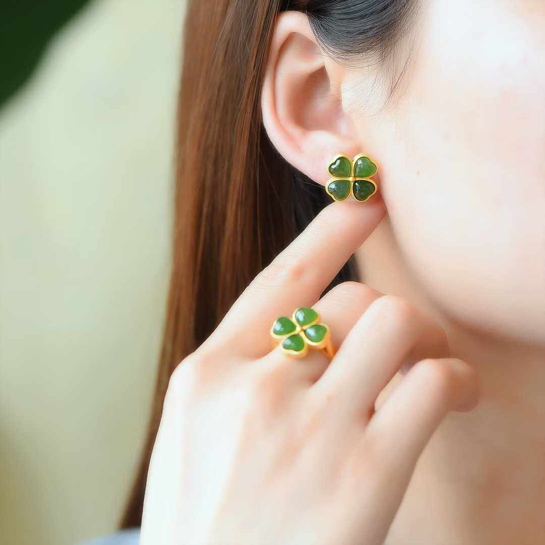 正品和田碧玉四叶草耳钉戒指套装女简约优雅耳饰女礼物耳环带证书