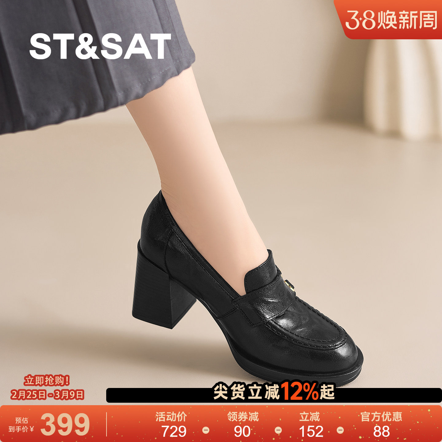 星期六真皮鞋子女2026新款乐福鞋黑色圆头粗跟软底不累脚百搭单鞋