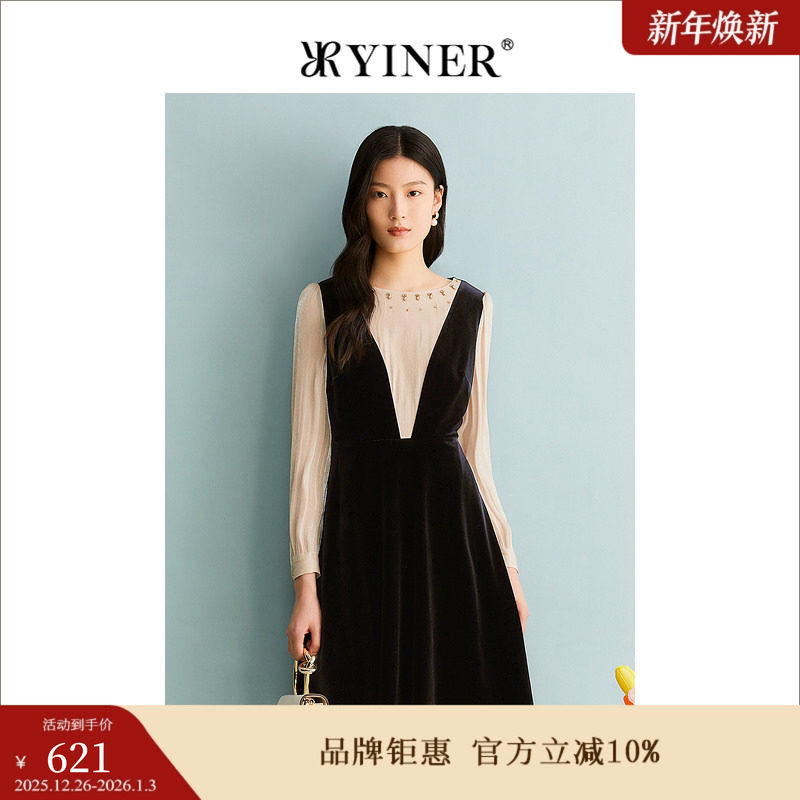 YINER音儿专选女装秋季法式优雅假两件丝绒质感钉钻连衣裙