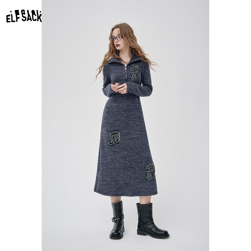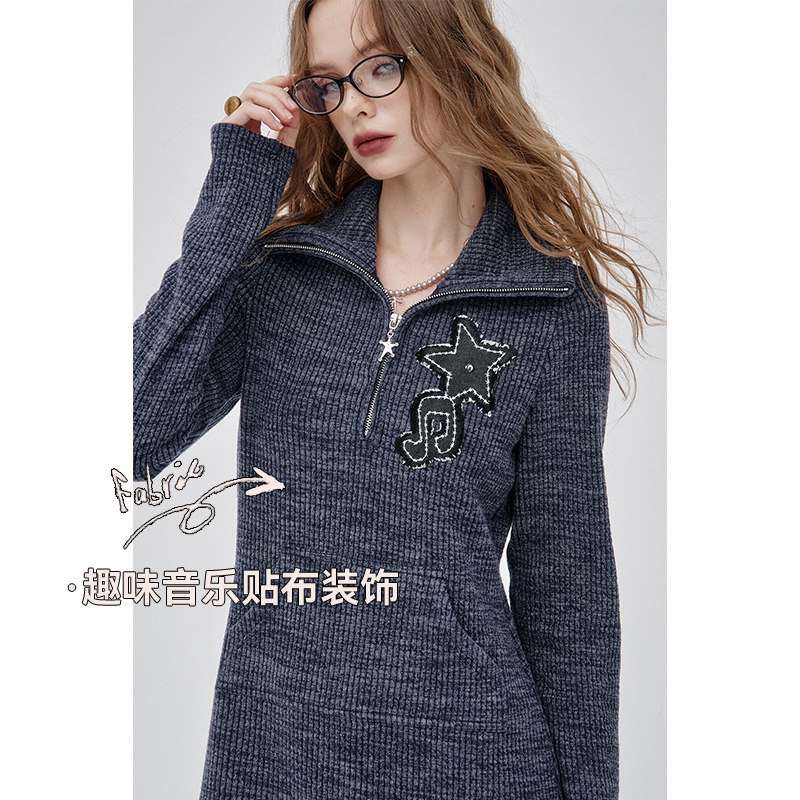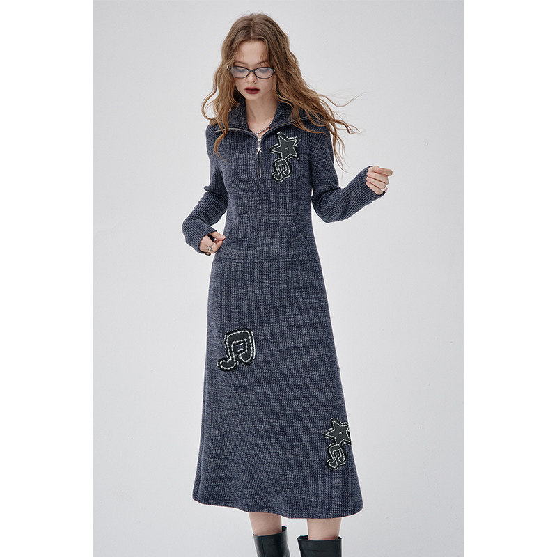 妖精的口袋趣味音乐贴布Polo领针织连衣裙女2025秋冬新款休闲裙子