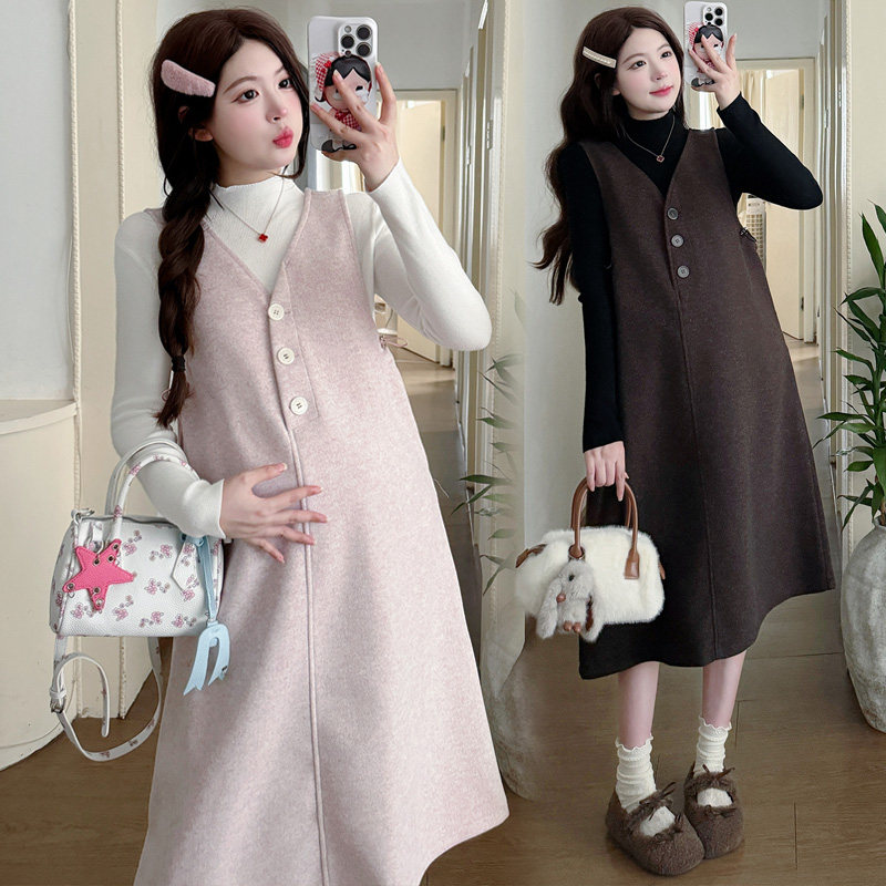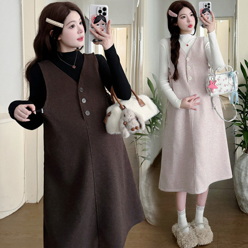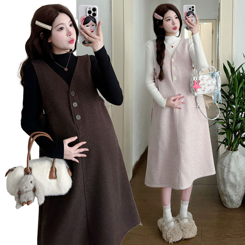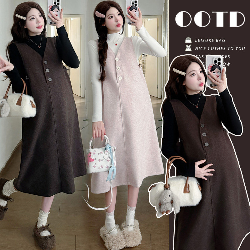 婧麒甜美风V领无袖背心孕妇连衣裙女秋冬长款A字显瘦减龄高级感