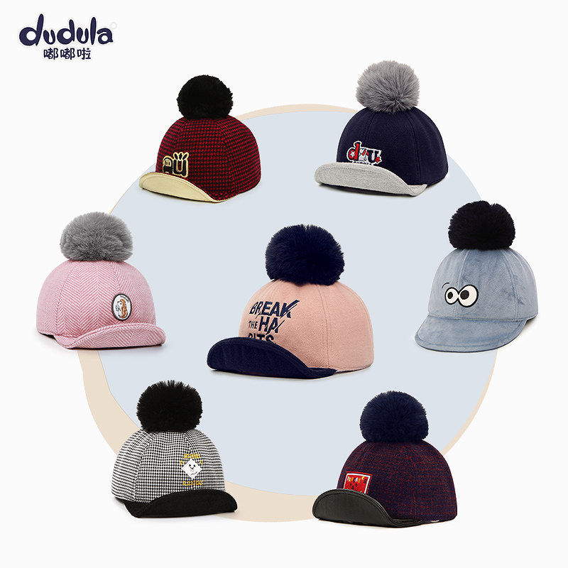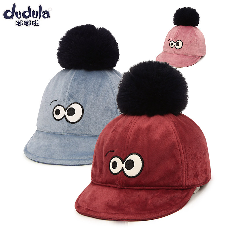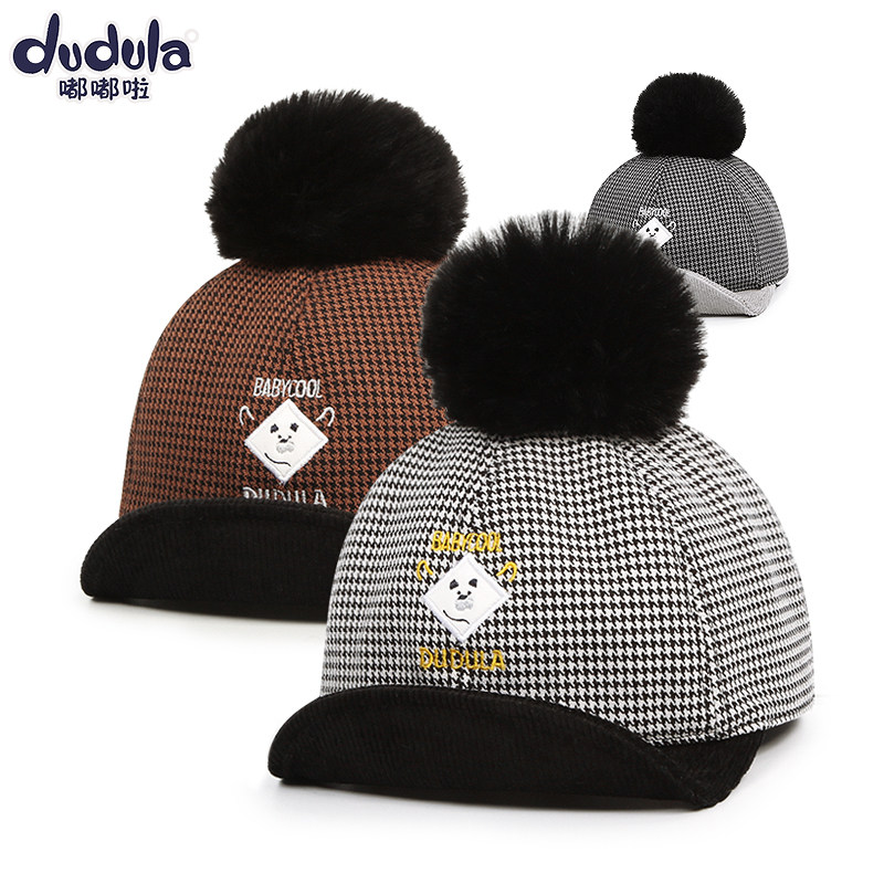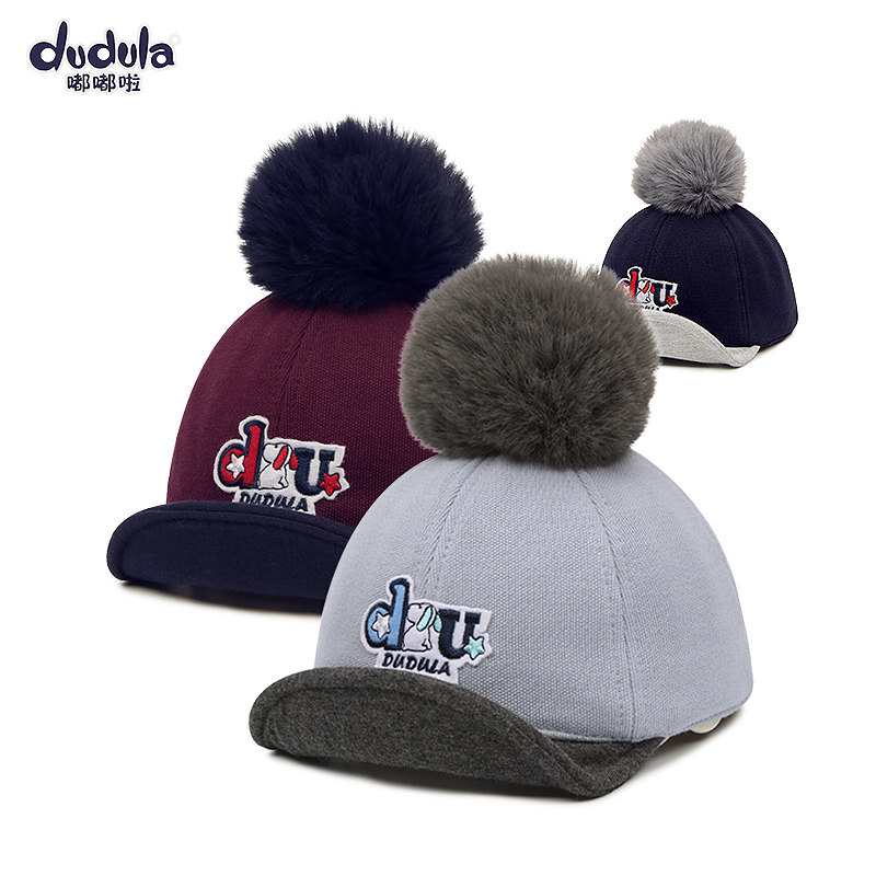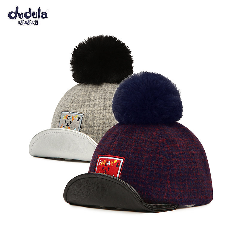 嘟嘟啦秋冬儿童鸭舌帽男女童棒球帽宝宝翘舌帽子软檐大毛球毛呢帽