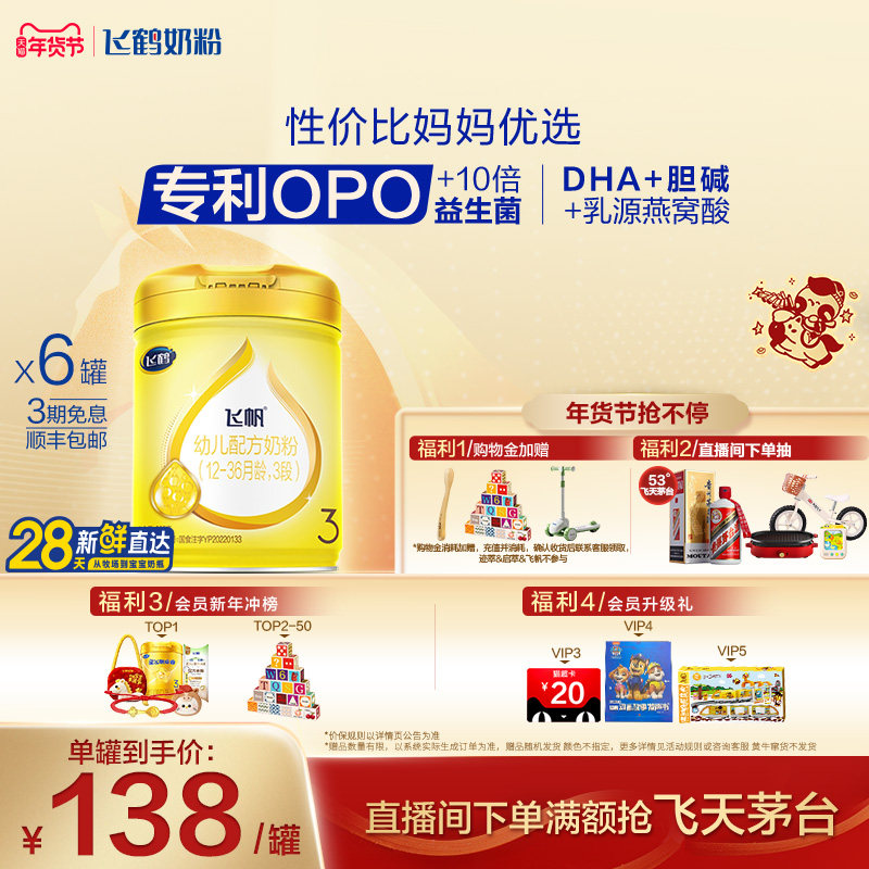 [官方正品]飞鹤飞帆呵护专利OPO促吸收3段婴幼儿配方奶粉900g*6罐